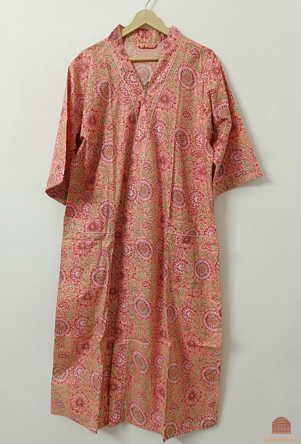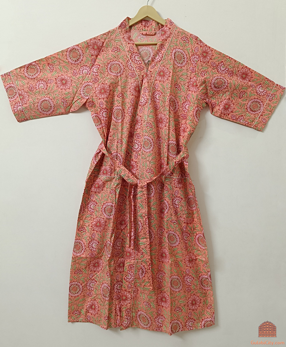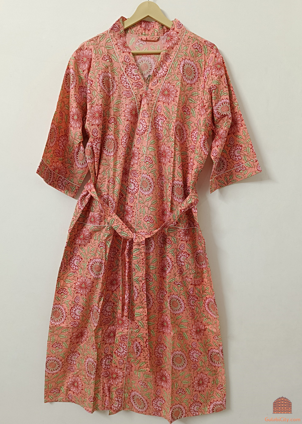 Peach Cotton Kimono Floral Block Printed Robe Bridal Wear Resort Wear Nightwear Gown Gifts For Her