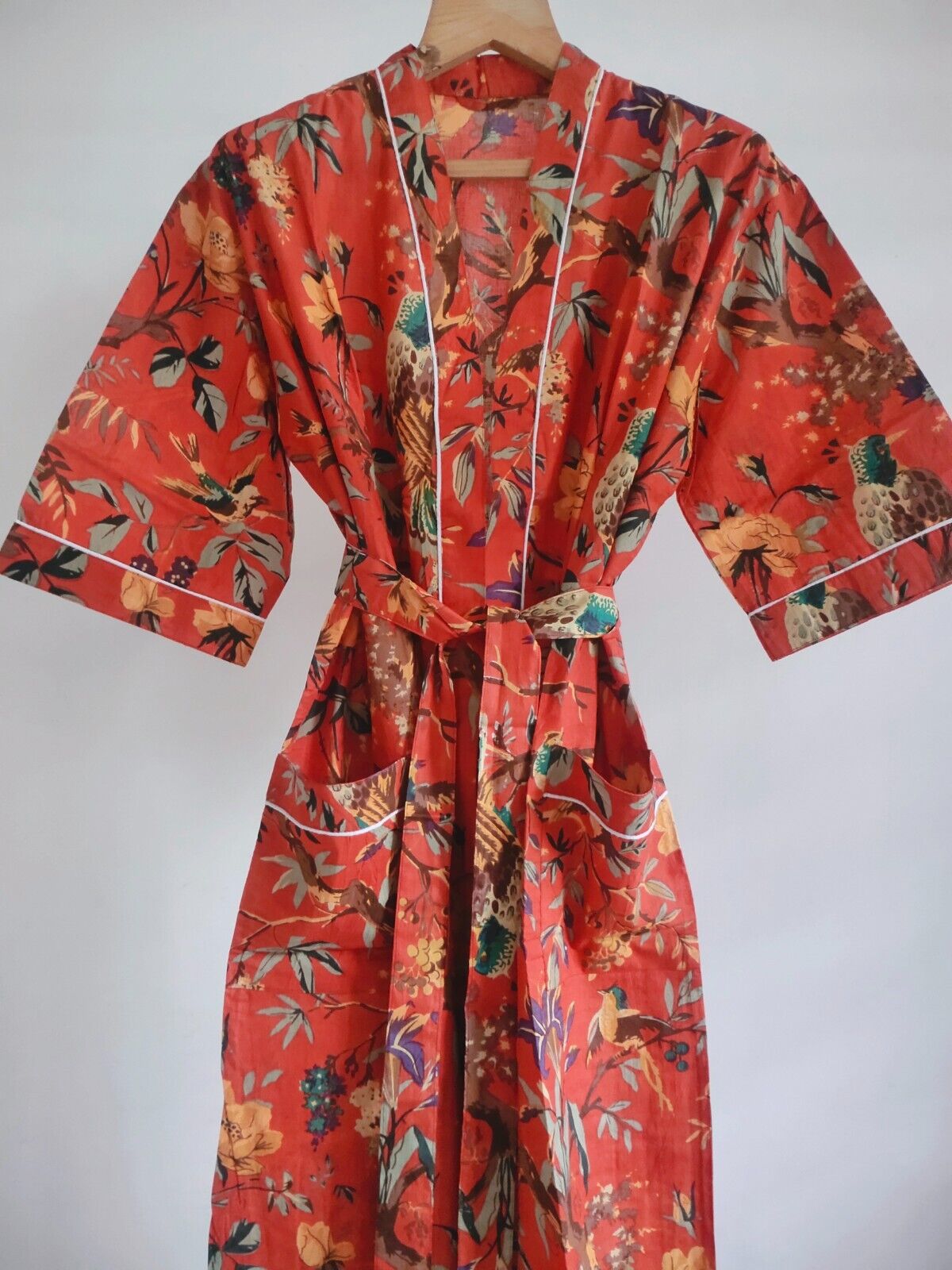 Cotton Red Kimono Robe Ladies Dressing Gown 100% Cotton Bathrobe Women Boho Lightweight Robe