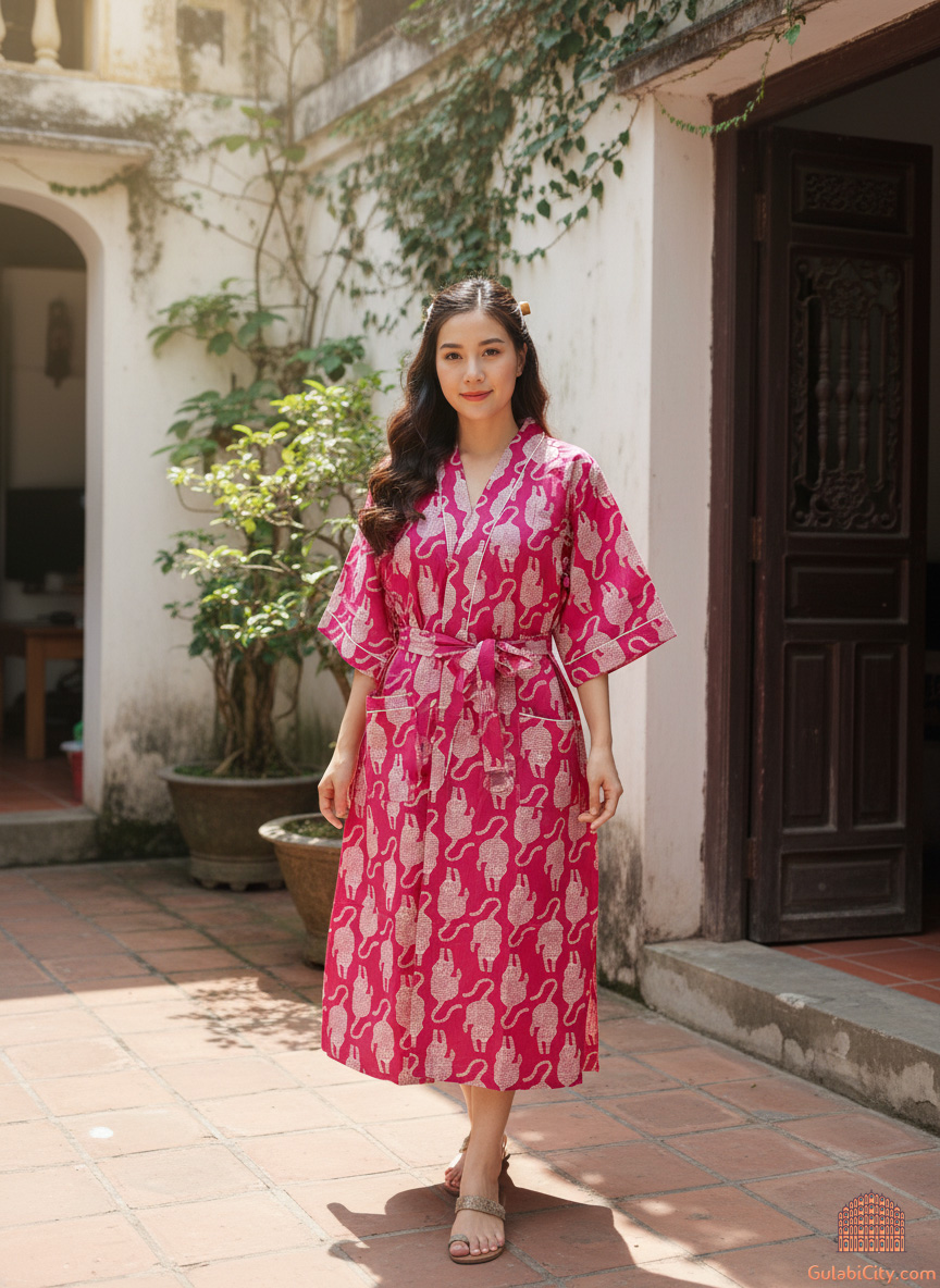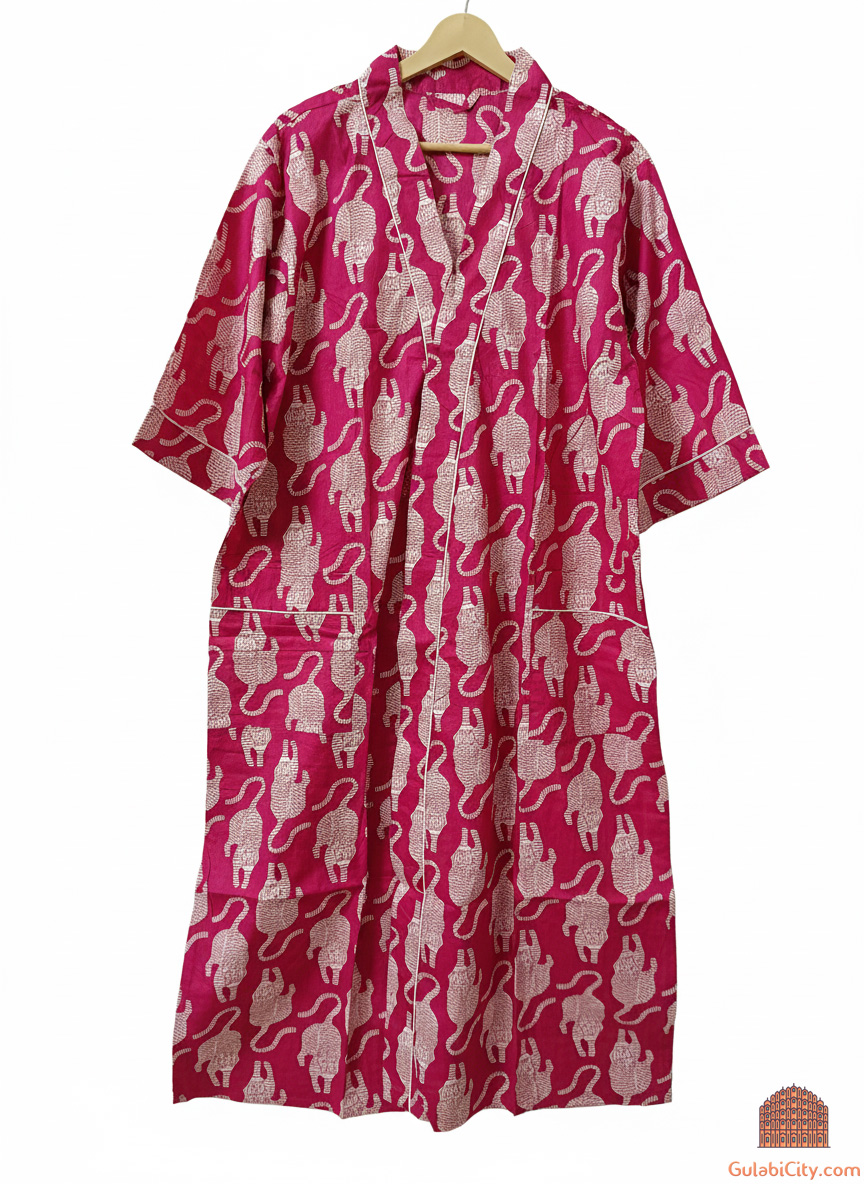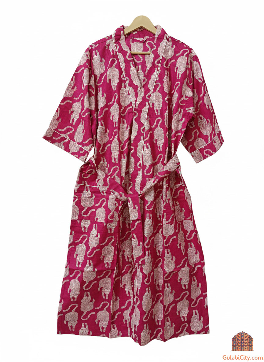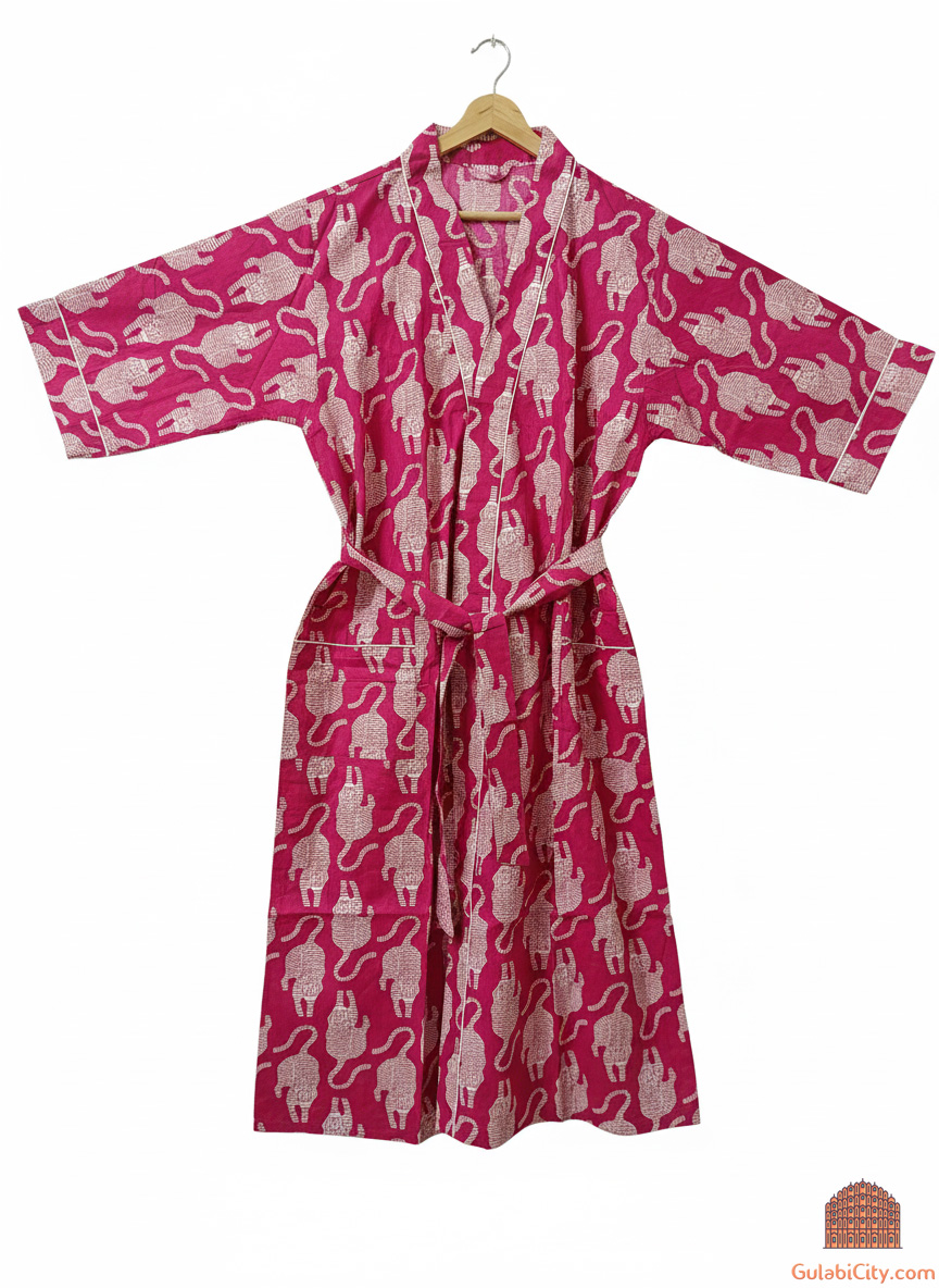 Pink Tiger Print Cotton Kimono Robe Dressing Gown Animal Block Print Bridesmaid Robe Summer Nightwear