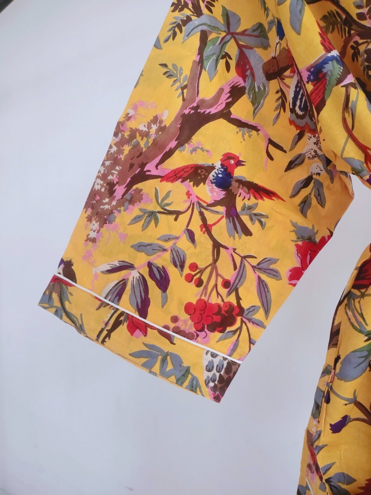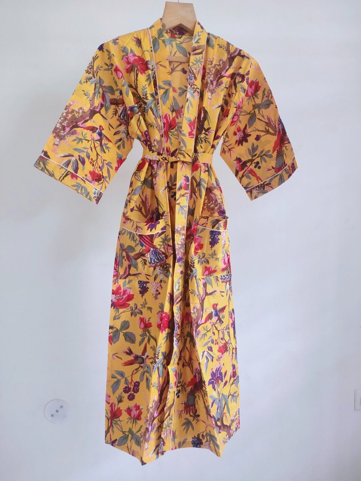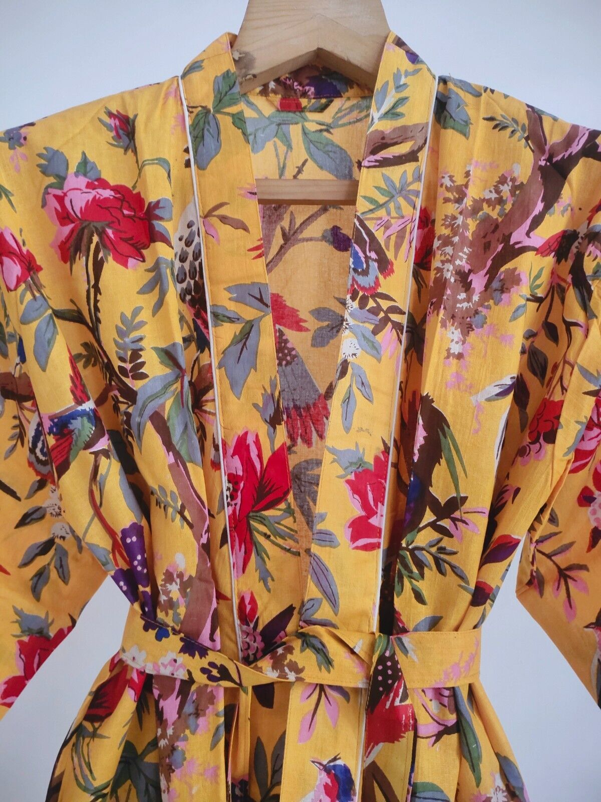 Pure Cotton Kimono Indian Handprinted Boho House Robe Summer Dress Bird Paradise Beach Coverup