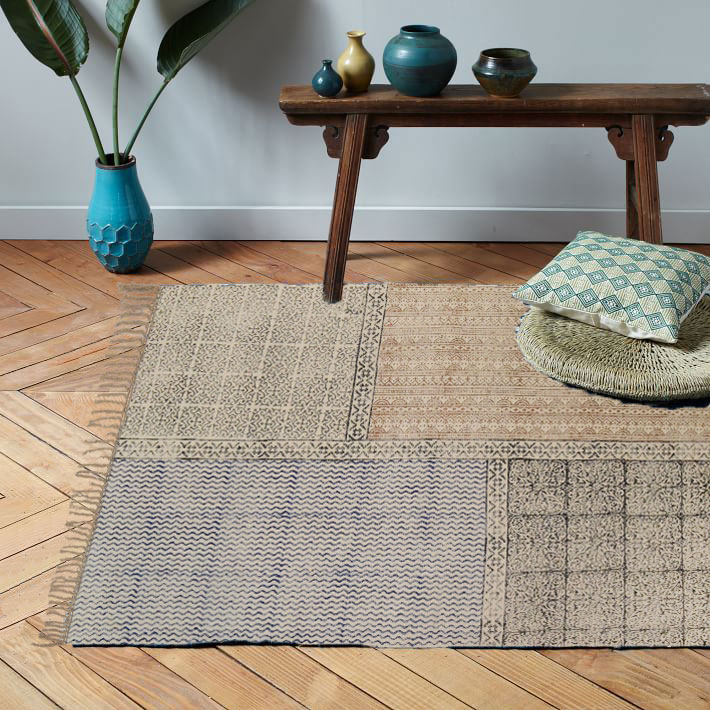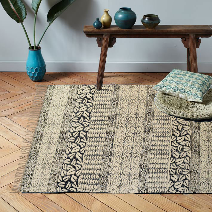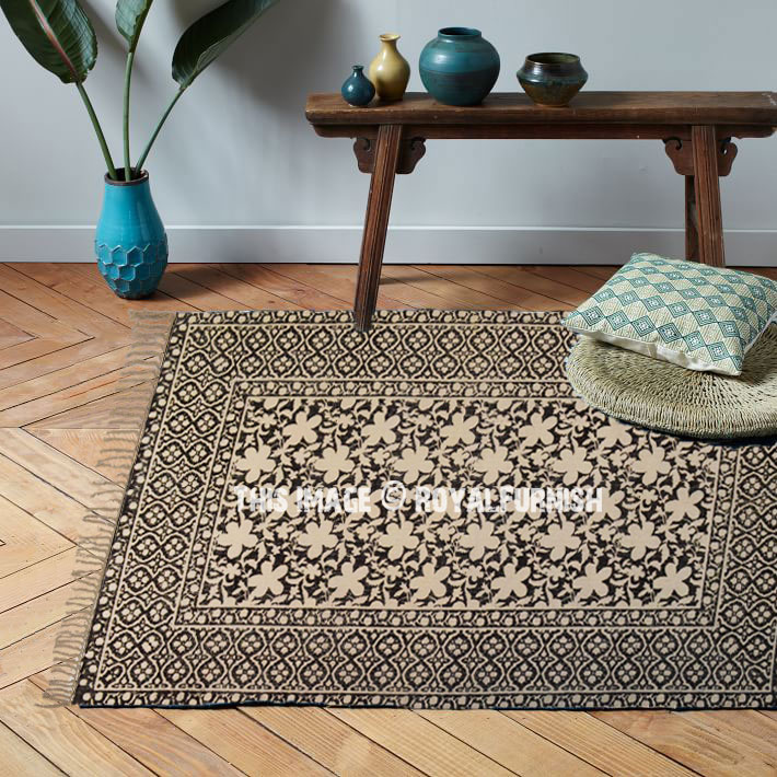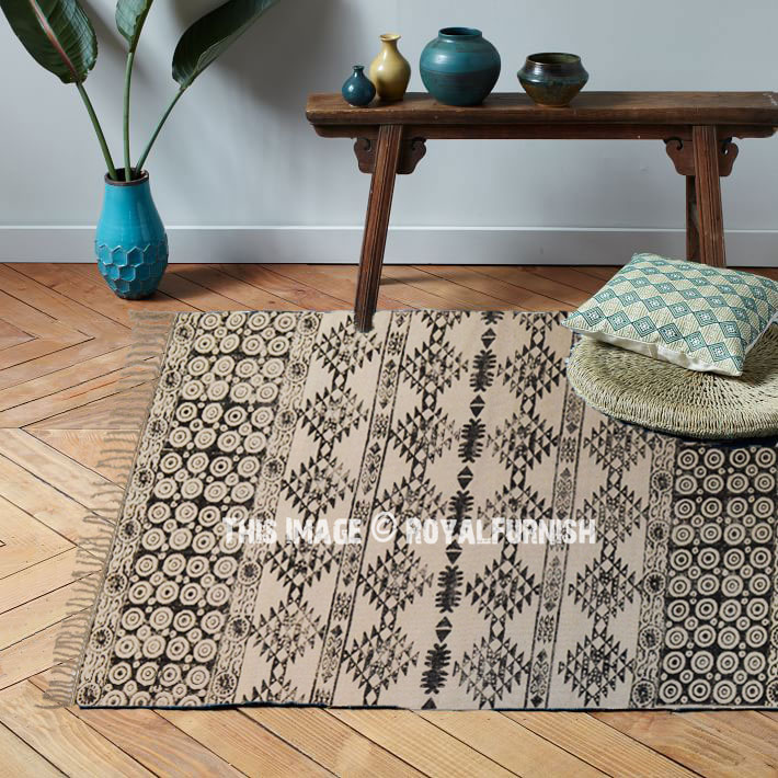 Design 4 Beige Multi Hand Block Printed Dhurrie Rug Indoor Outdoor Rag Rugs for Living Room