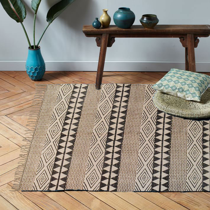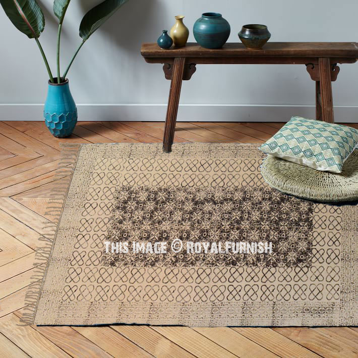 Design 7 Beige Multi Hand Block Printed Dhurrie Rug Indoor Outdoor Rag Rugs for Living Room