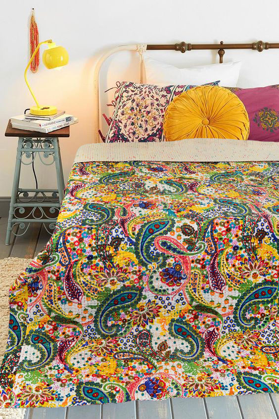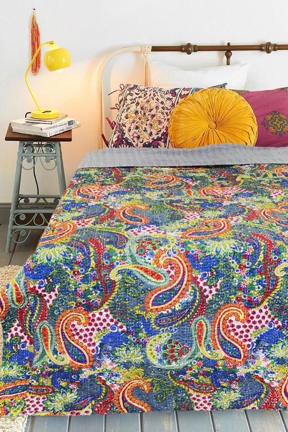 The kantha quilt is made with popular hand embroidery which comes from Southern Asia and all layered are stitched together. It has beautiful colors, intricate pattern and opulence running hand stitching into multiple color threads. It not only adds interest to a neutral bedroom scheme but also give outstanding look to your table if you use it as table cloth. It is warm, cozy, light weighted and soft kantha blankets which can be used as lap blanket into winter season.