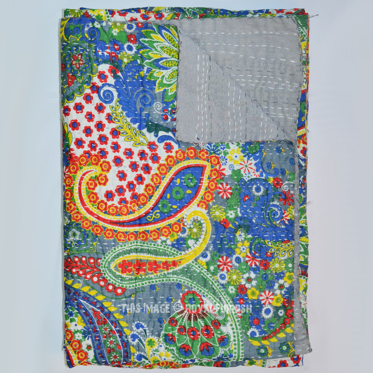 Grey Boho Colorful Paisley Print Cotton Handmade Kantha Quilt Queen Size Bedspread Blanket Throw