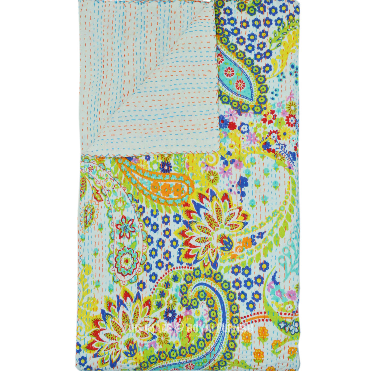 White Boho Colorful Paisley Print Cotton Handmade Kantha Quilt Queen Size Bedspread Blanket Throw