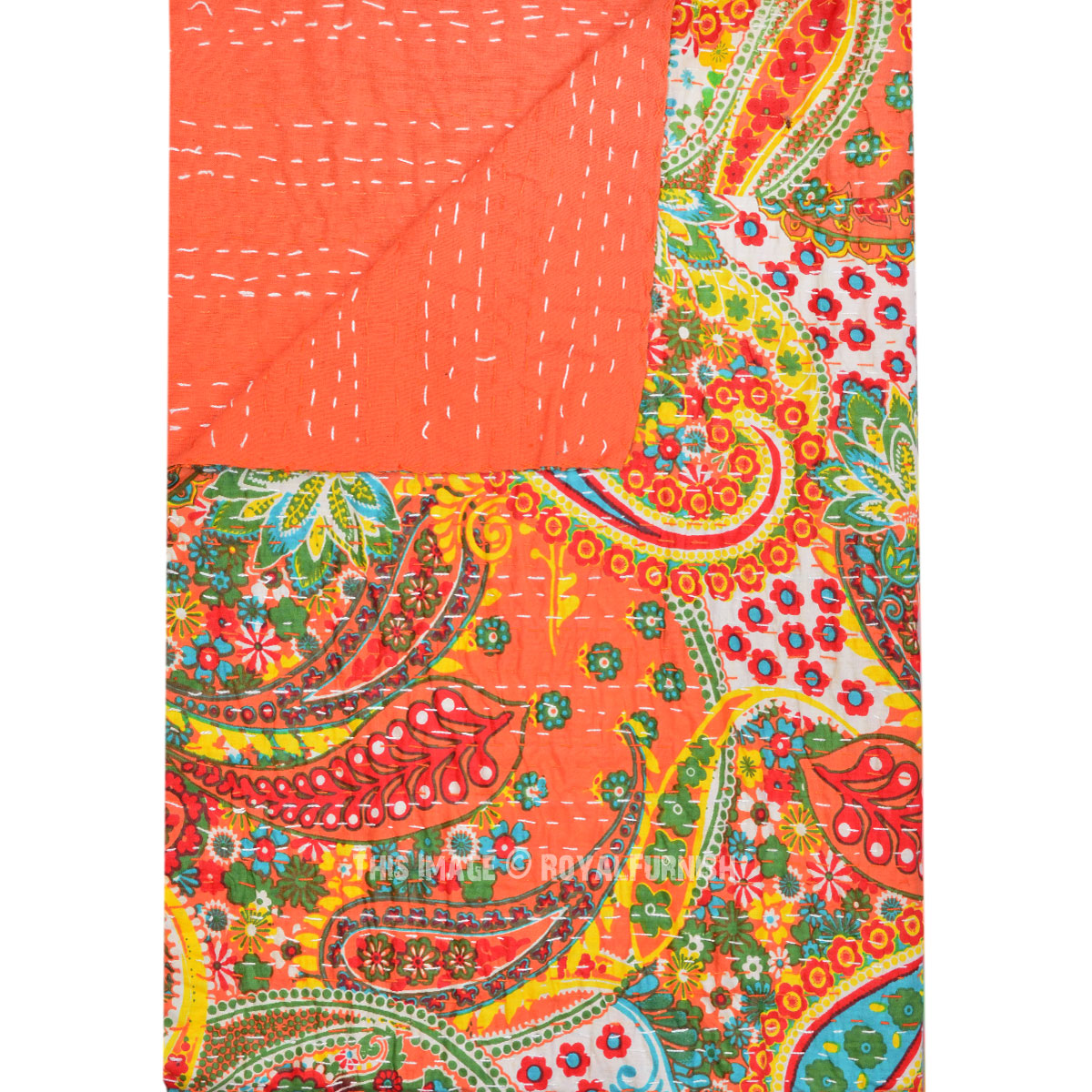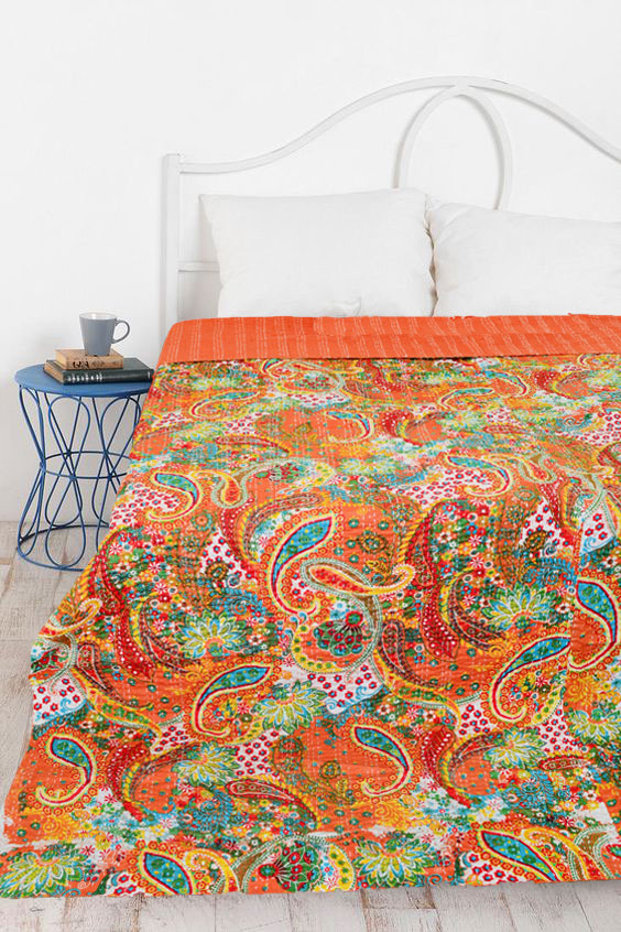 Orange Boho Colorful Paisley Print Cotton Handmade Kantha Quilt Queen Size Bedspread Blanket Throw