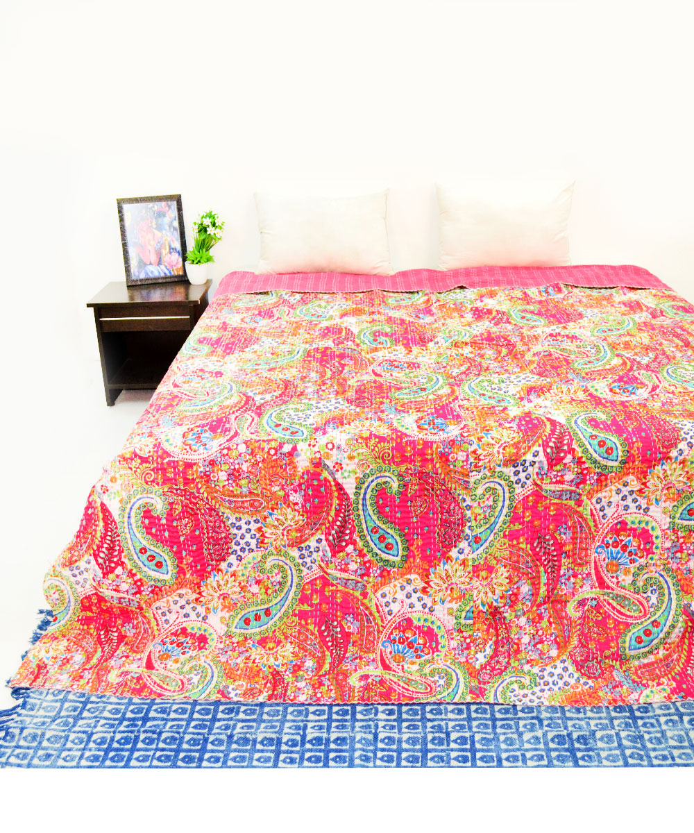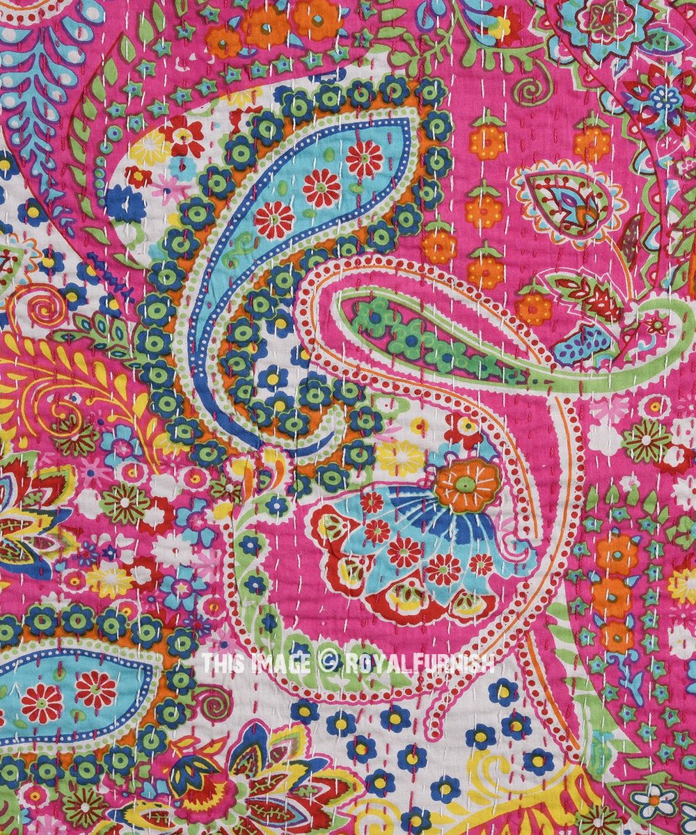 Pink Boho Colorful Paisley Print Cotton Handmade Kantha Quilt Queen Size Bedspread Blanket Throw