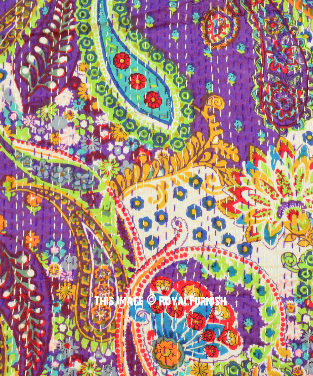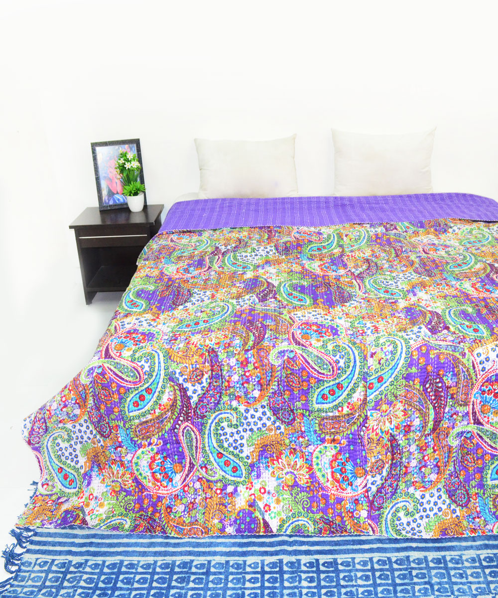 Purple Boho Colorful Paisley Print Cotton Handmade Kantha Quilt Queen Size Bedspread Blanket Throw