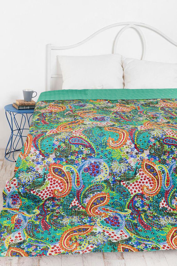 Sea Green Boho Colorful Paisley Print Cotton Handmade Kantha Quilt Queen Size Bedspread Blanket Throw