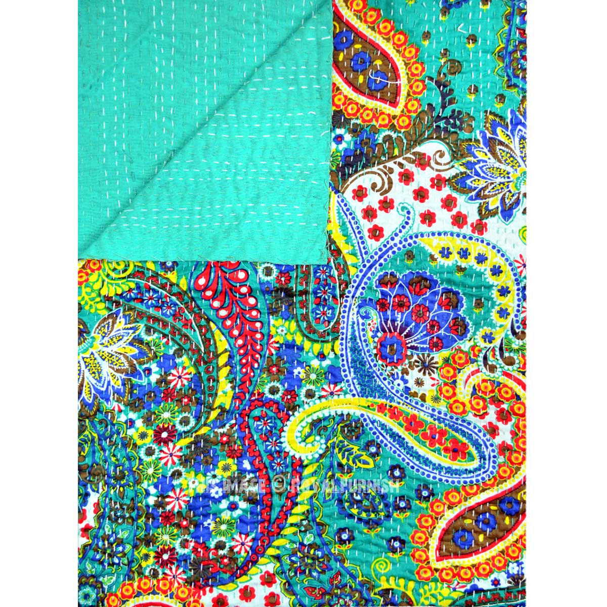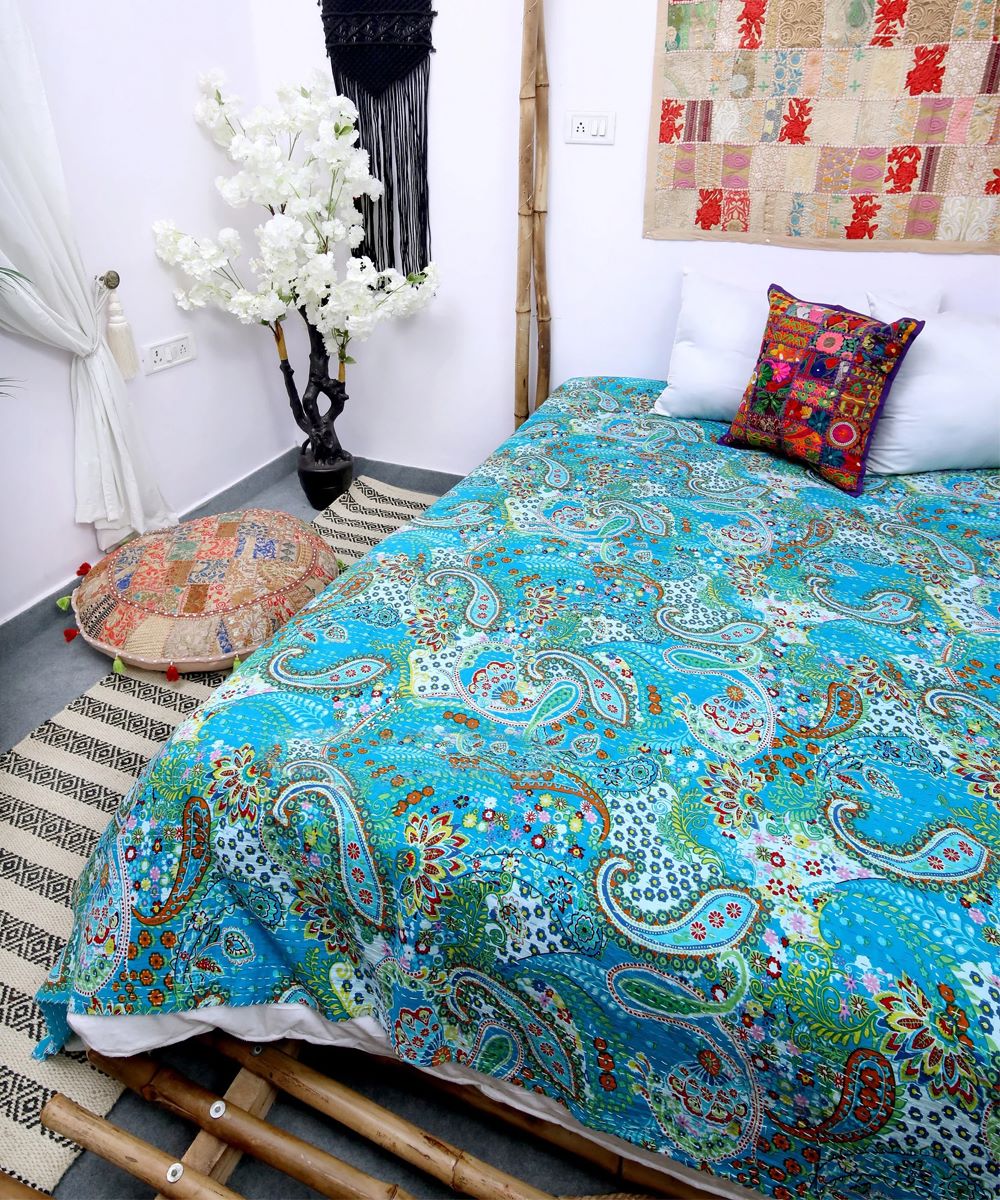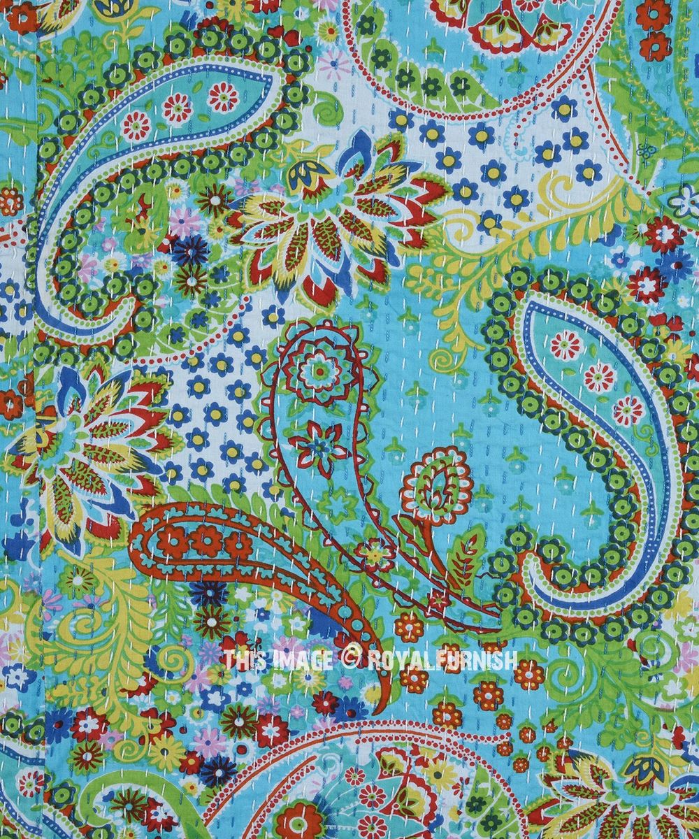 Turquoise Boho Colorful Paisley Print Cotton Handmade Kantha Quilt Queen Size Bedspread Blanket Throw