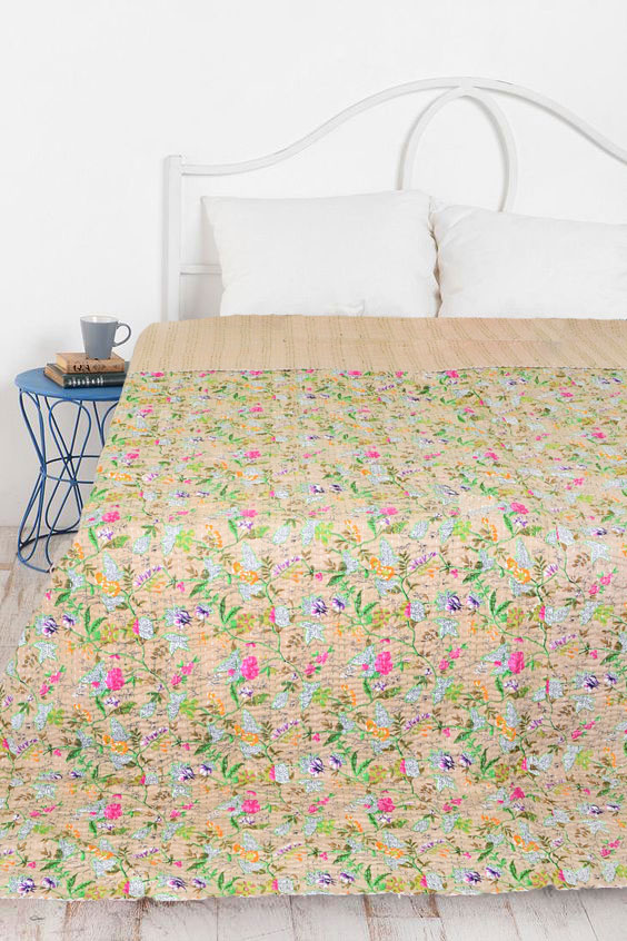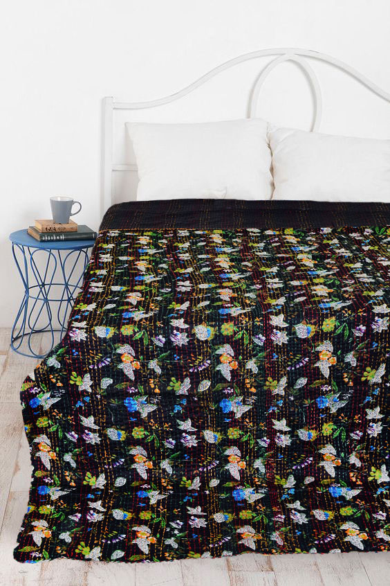 The kantha quilt is made with popular hand embroidery which comes from Southern Asia and all layered are stitched together. It has beautiful colors, intricate pattern and opulence running hand stitching into multiple color threads. It not only adds interest to a neutral bedroom scheme but also give outstanding look to your table if you use it as table cloth. It is warm, cozy, light weighted and soft kantha blankets which can be used as lap blanket into winter season.