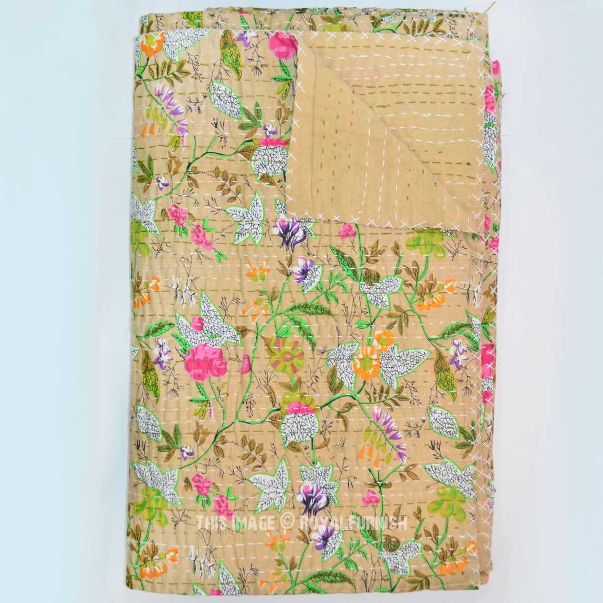 Beige Special Rajasthani Floral Print Kantha Quilt Cotton Handmade Queen Bedspread Blanket Throw
