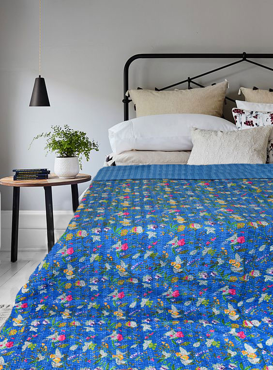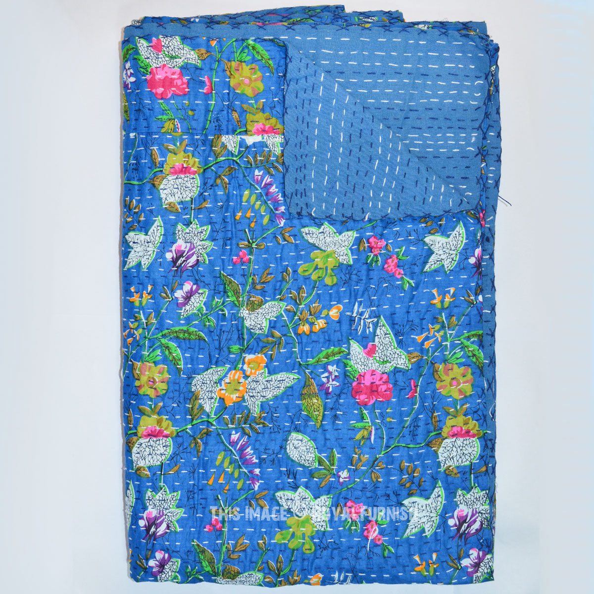 Blue Special Rajasthani Floral Print Kantha Quilt Cotton Handmade Queen Bedspread Blanket Throw