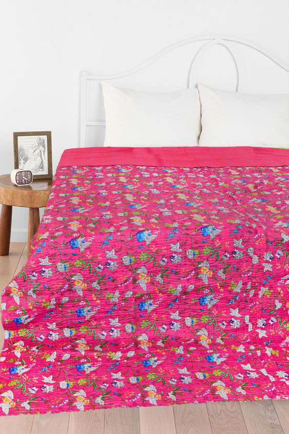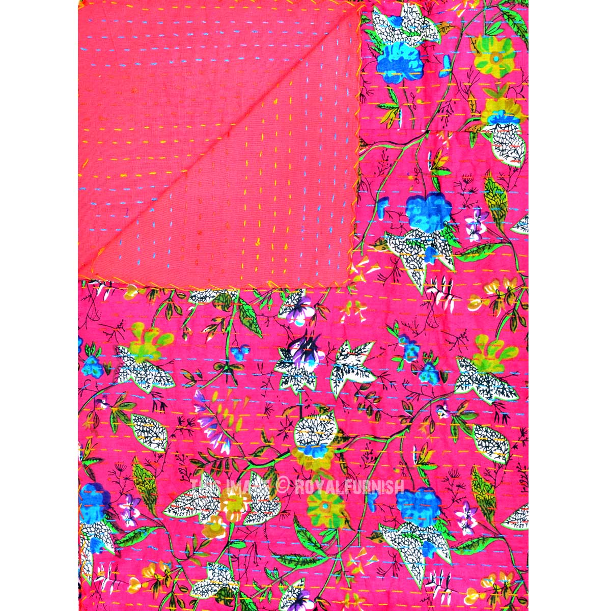 Pink Special Rajasthani Floral Print Kantha Quilt Cotton Handmade Queen Bedspread Blanket Throw