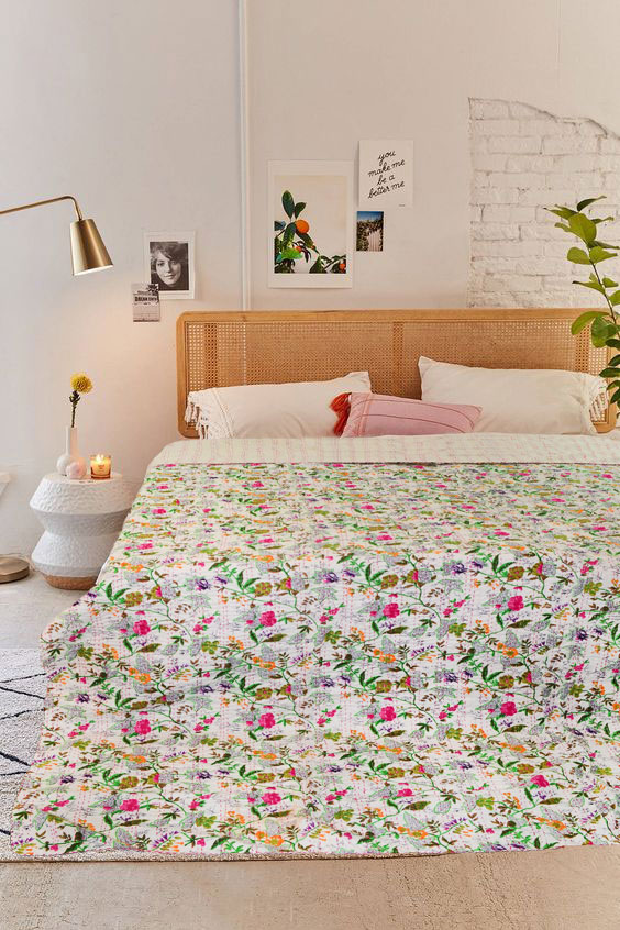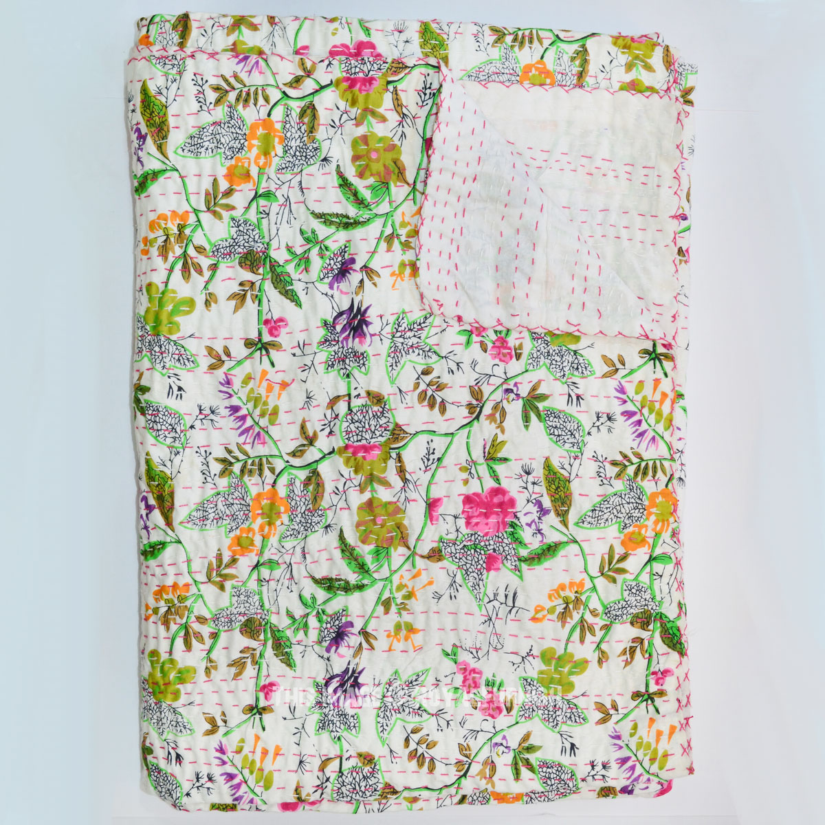 Special Rajasthani Floral Print Kantha Quilt Cotton Handmade Queen Bedspread Blanket Throw