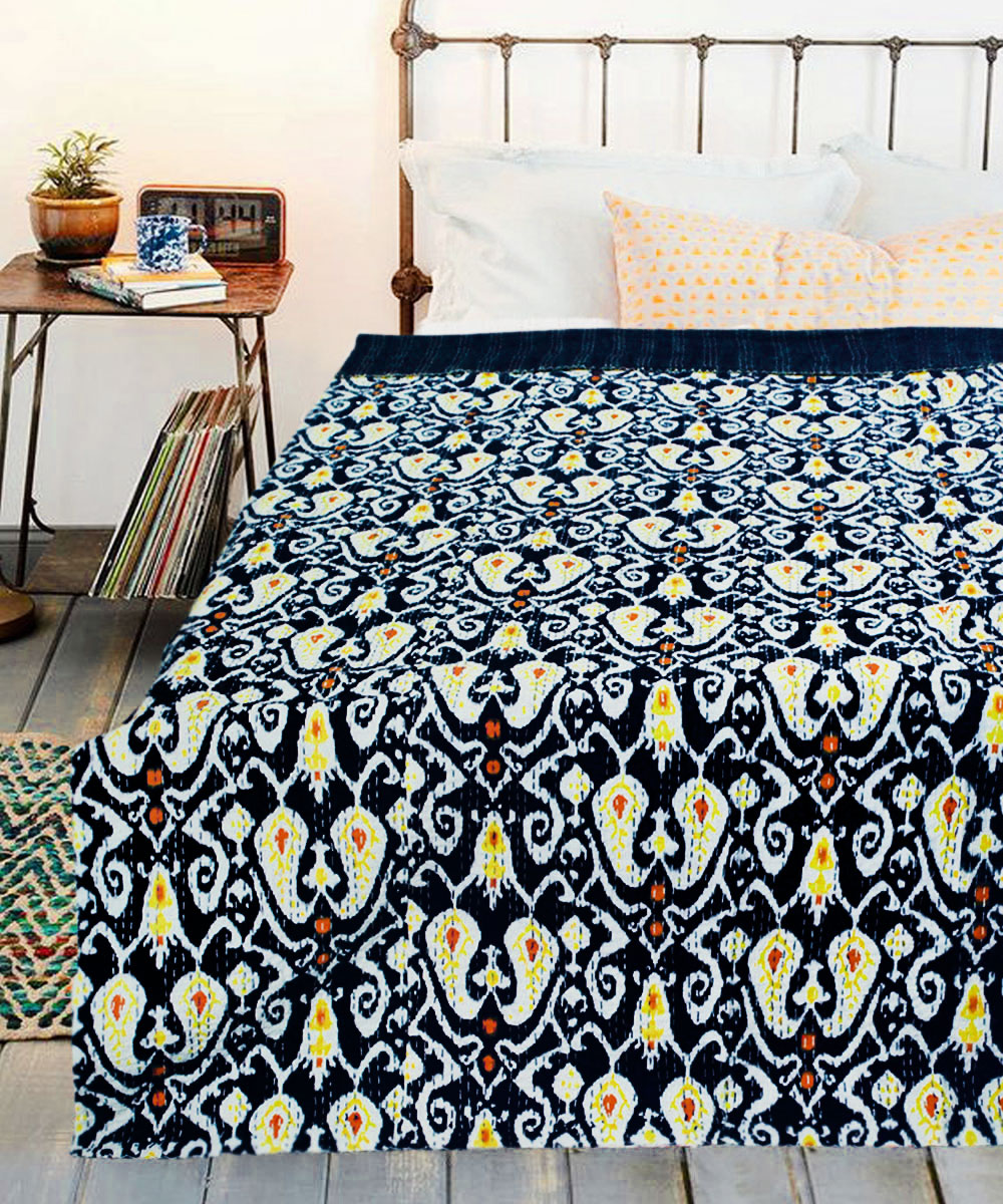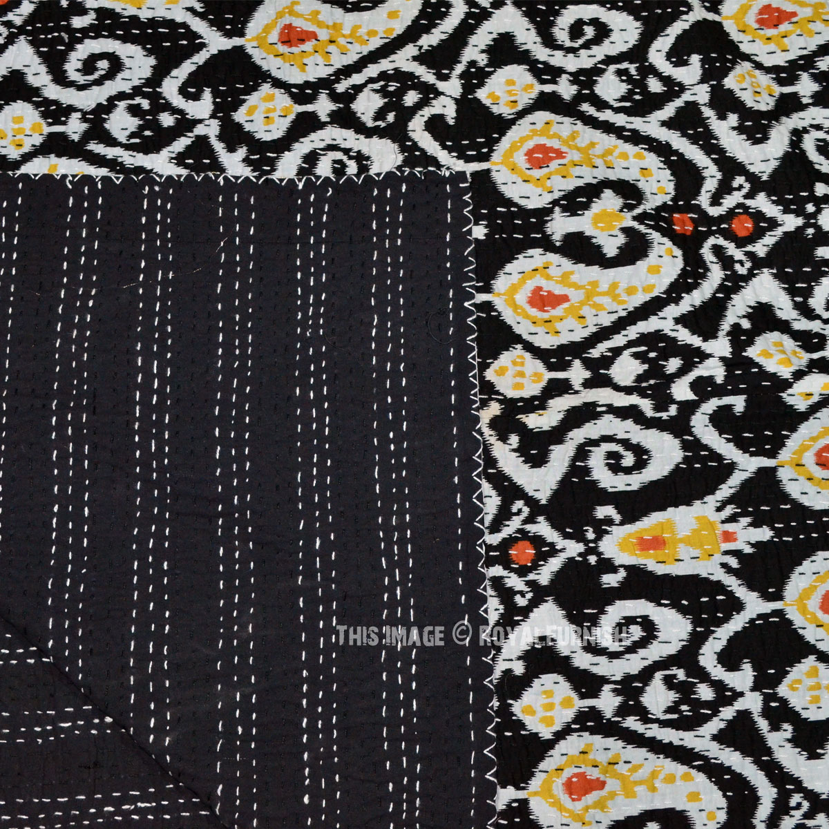 Black Stunning Paisley Ikat Print Hand Stitched Kantha Quilt Cotton Twin Blanket Throw Bed Cover