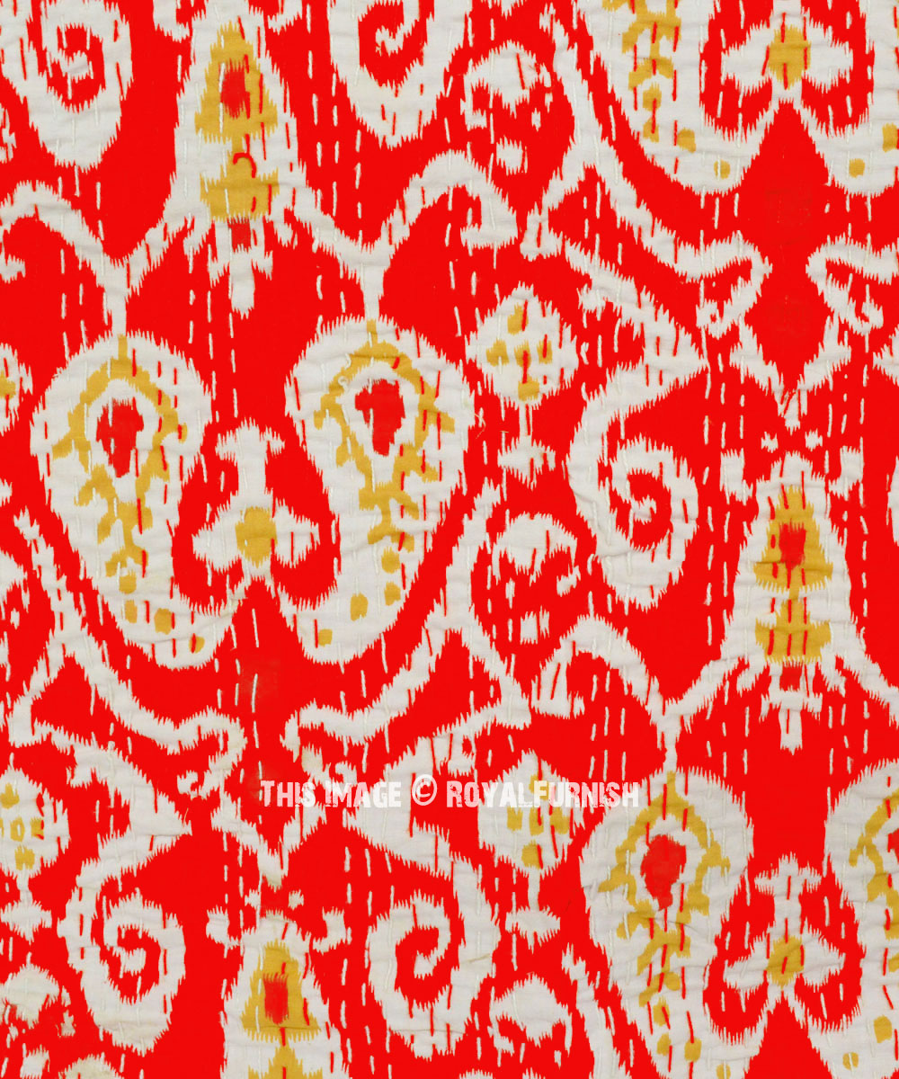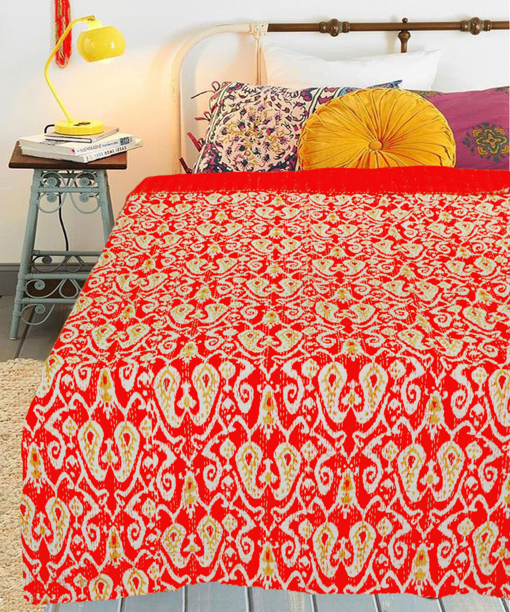 Red Stunning Paisley Ikat Print Hand Stitched Kantha Quilt Cotton Twin Blanket Throw Bed Cover