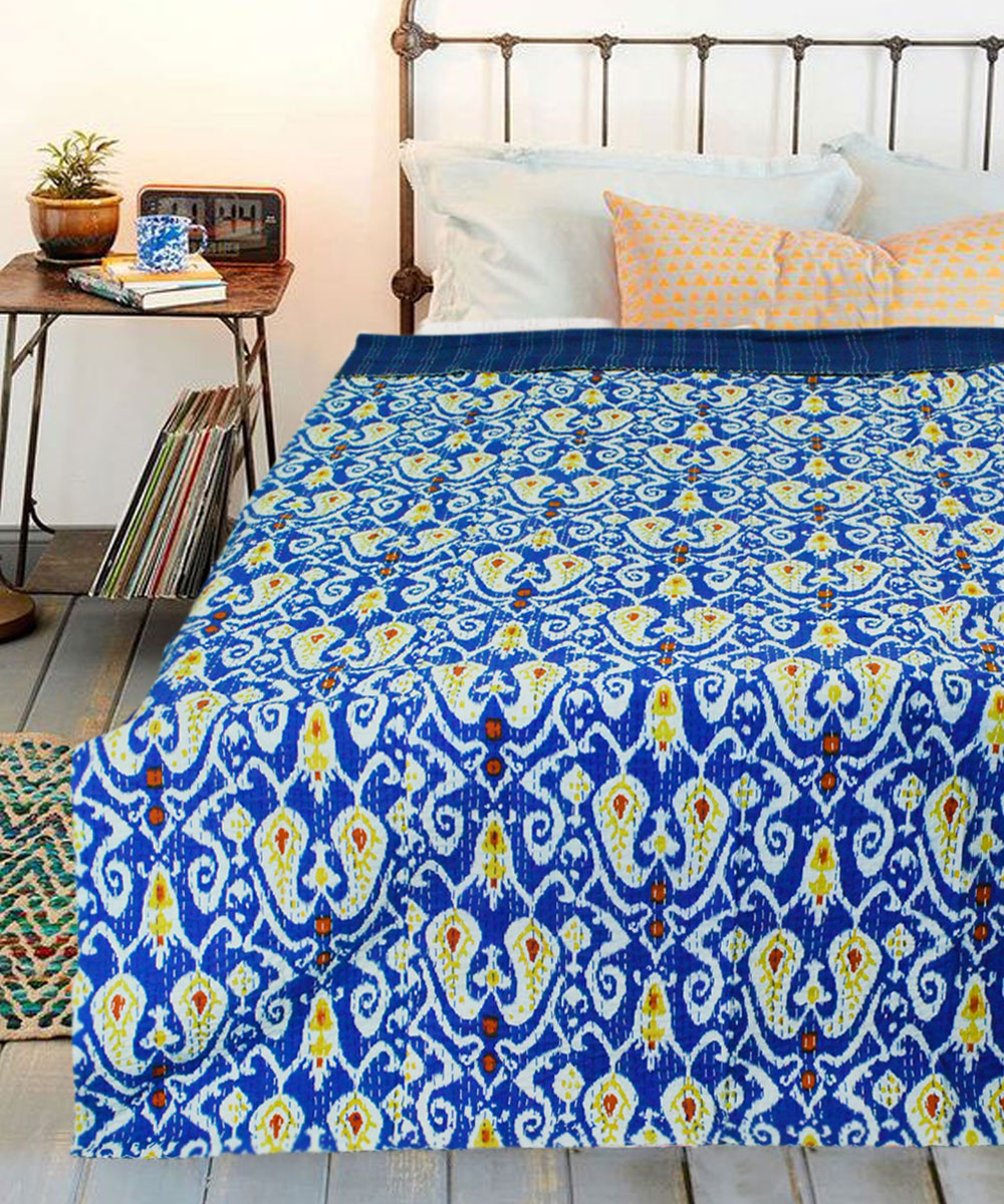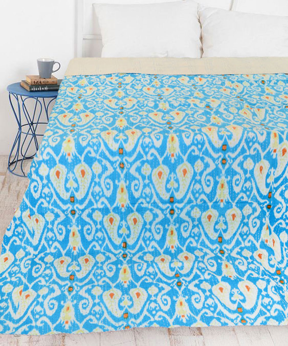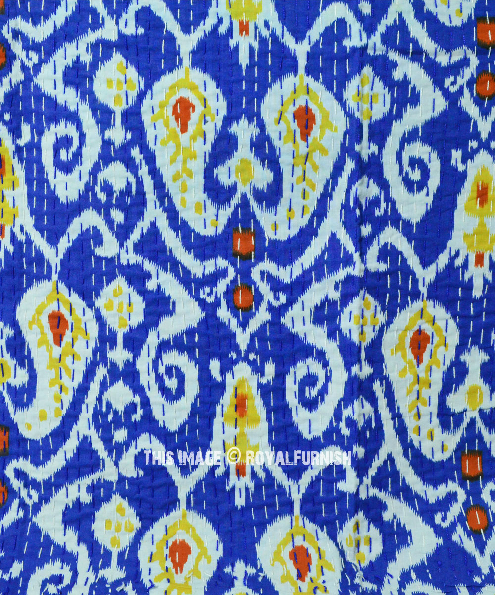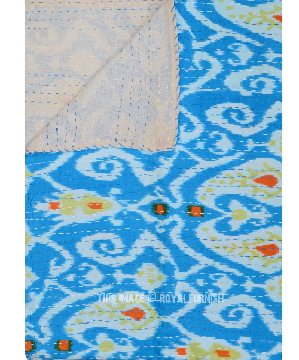 Blue Stunning Paisley Ikat Print Hand Stitched Kantha Quilt Cotton Twin Blanket Throw Bed Cover