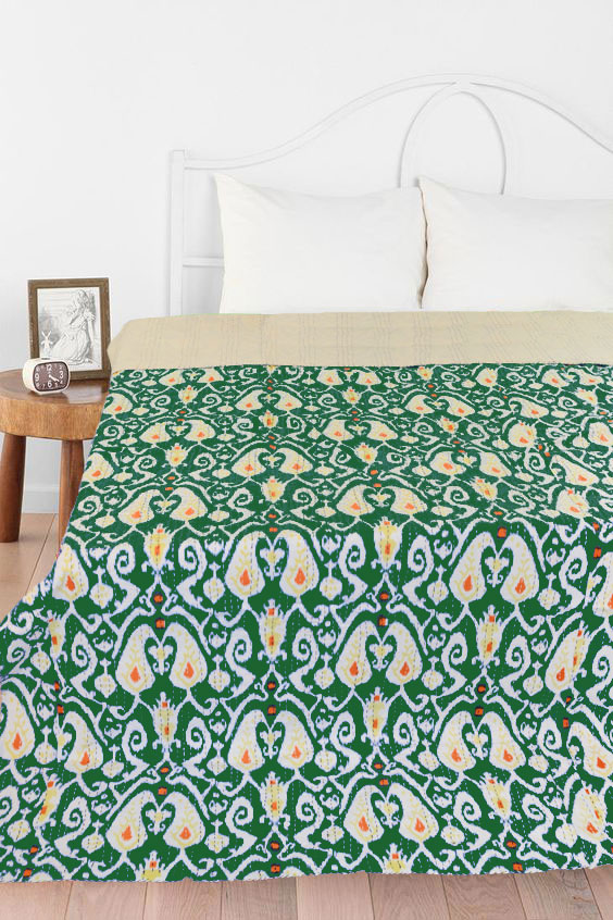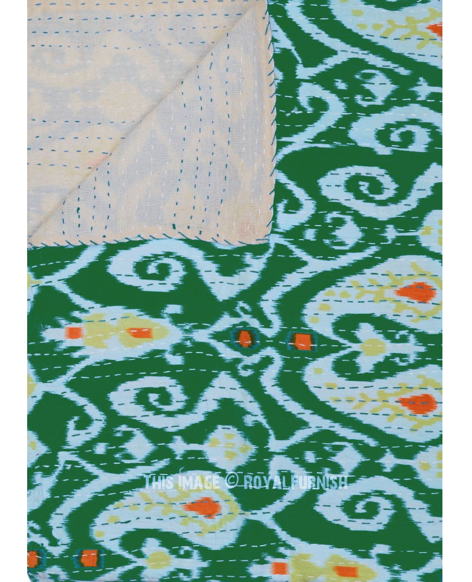 Green Stunning Paisley Ikat Print Hand Stitched Kantha Quilt Cotton Twin Blanket Throw Bed Cover