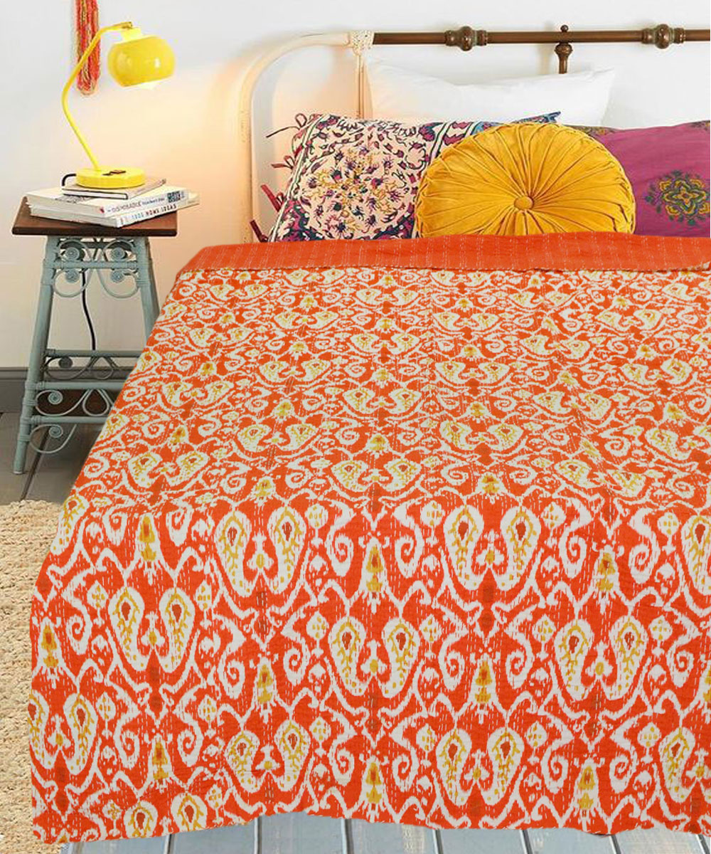 Orange Stunning Paisley Ikat Print Hand Stitched Kantha Quilt Cotton Twin Blanket Throw Bed Cover