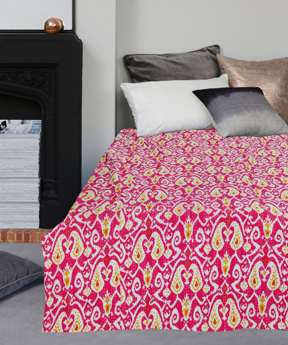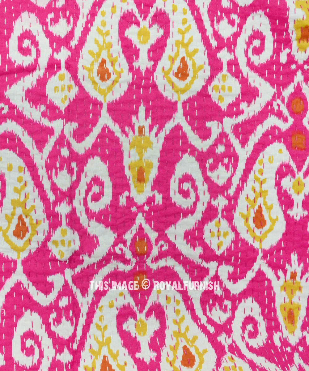 Pink Stunning Paisley Ikat Print Hand Stitched Kantha Quilt Cotton Twin Blanket Throw Bed Cover