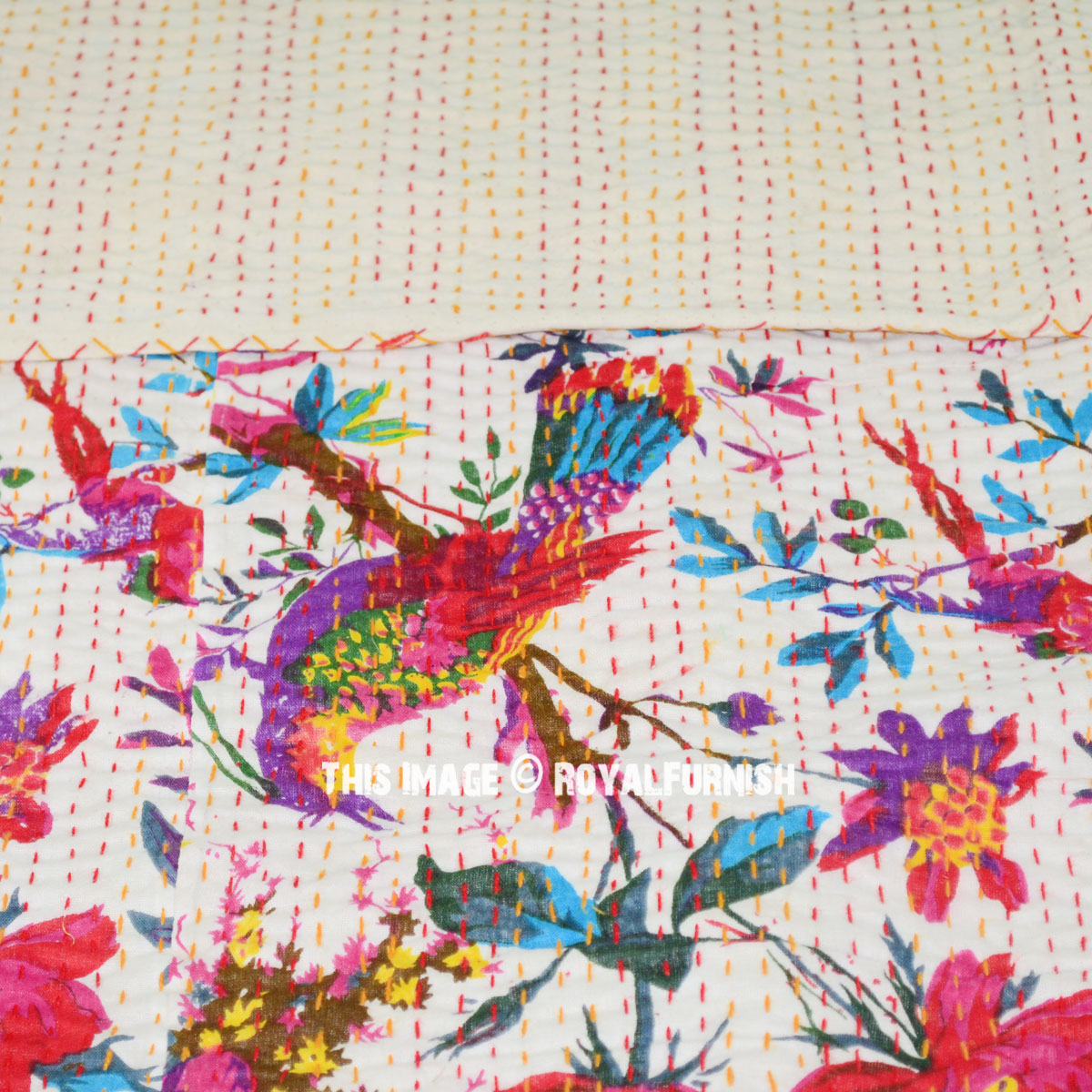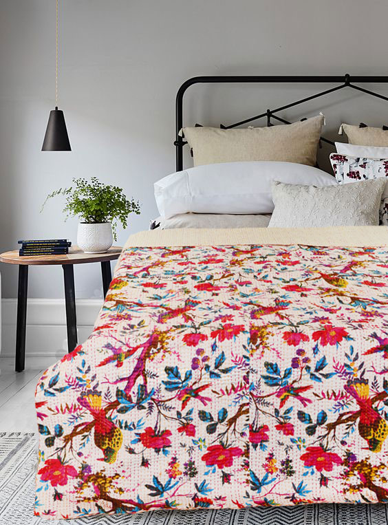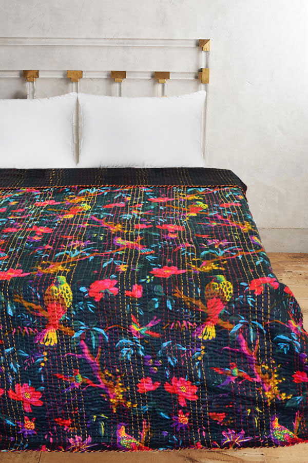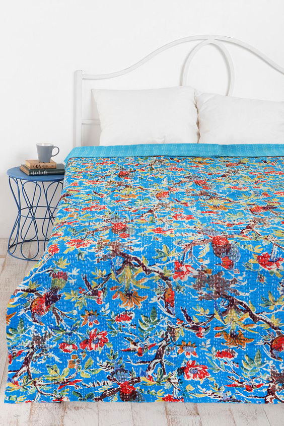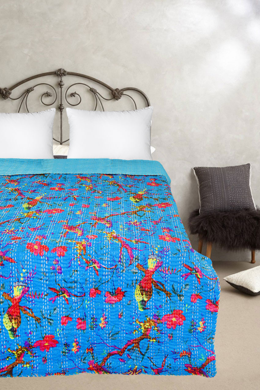 Adds warm, cozy and comforting effect to bedroom interior with Indian birds paradise kantha quilt and improve personality of bedroom interior by adding hand stitching kantha quilts. It is made in rural areas of India where women do this hand stitching traditional kantha stitching on cotton fabric. A multipurpose quilt can be used as throw, quilt and blanket. Add a wonderfully homely air to any bedroom, infusing it with love and charm.