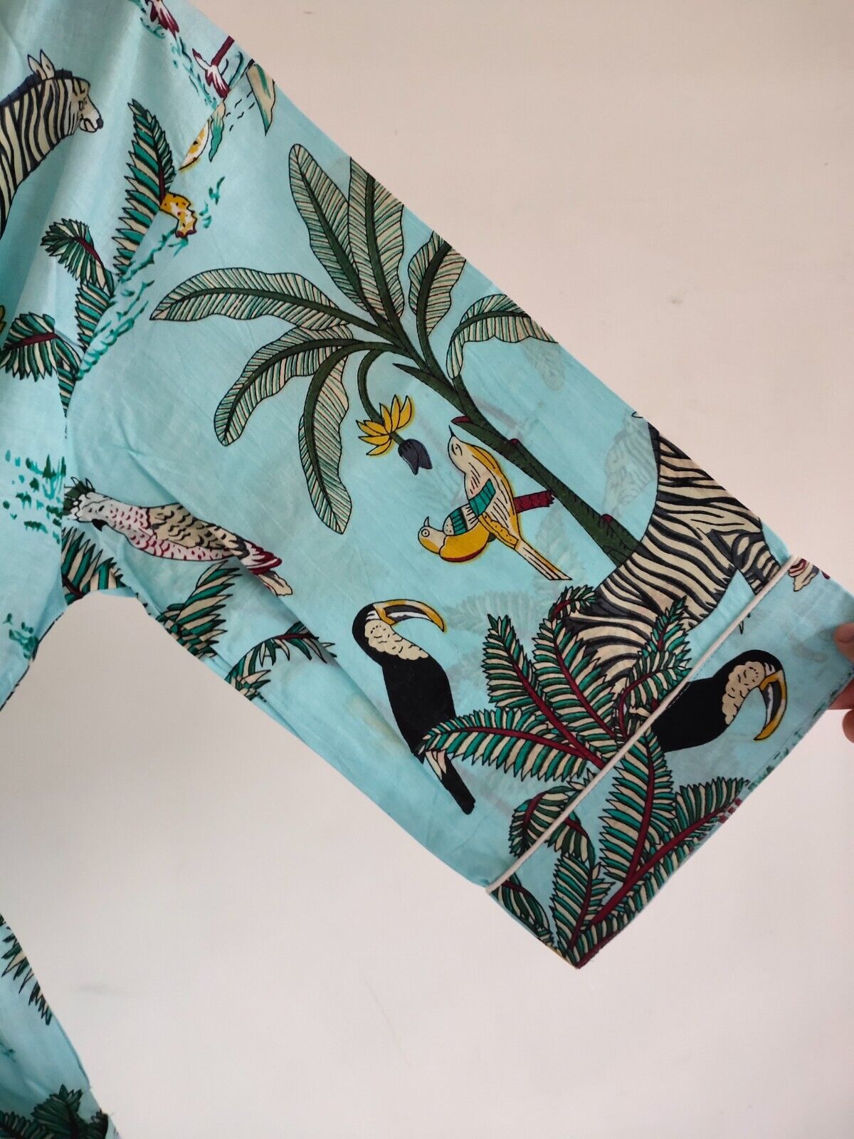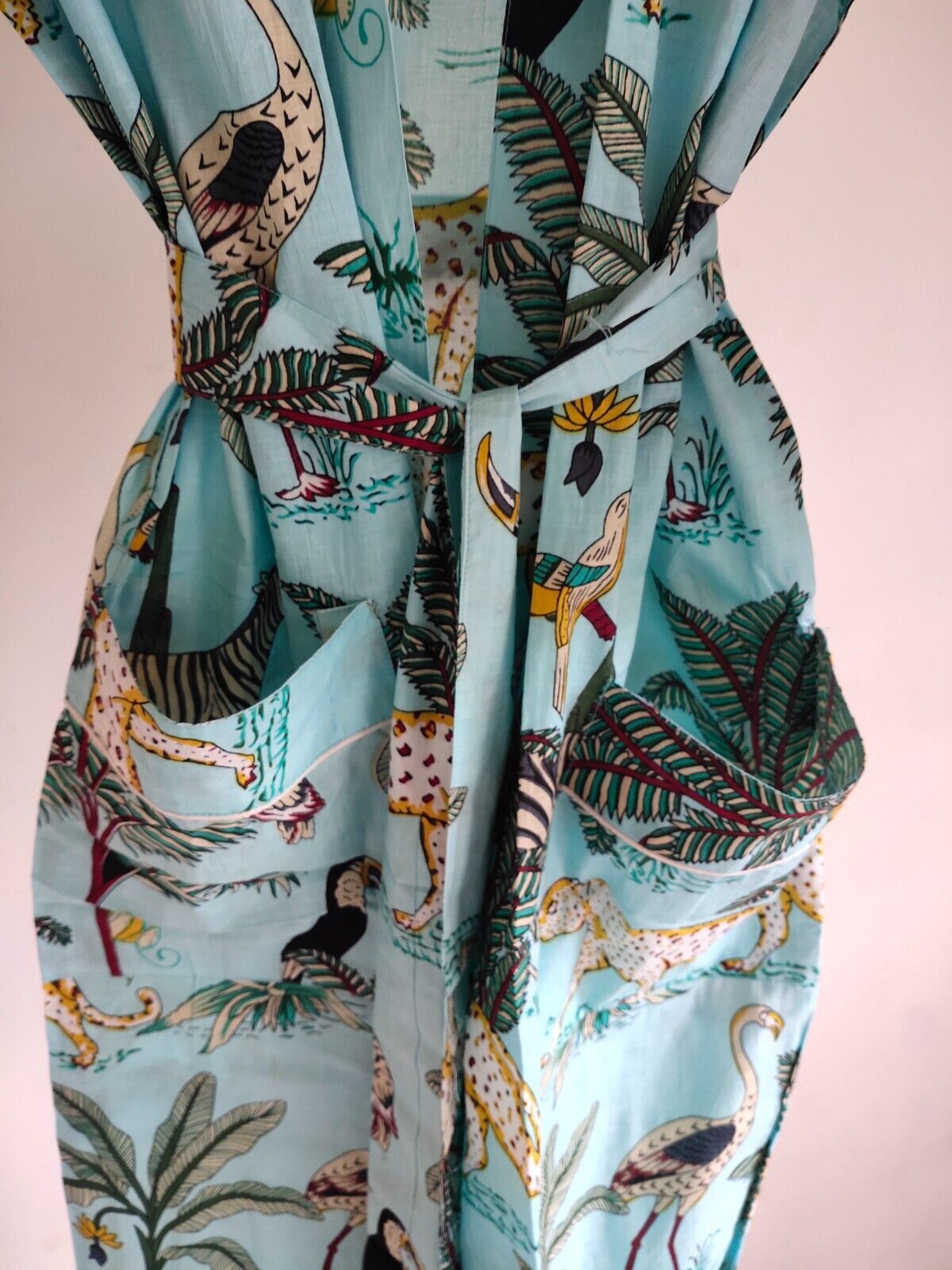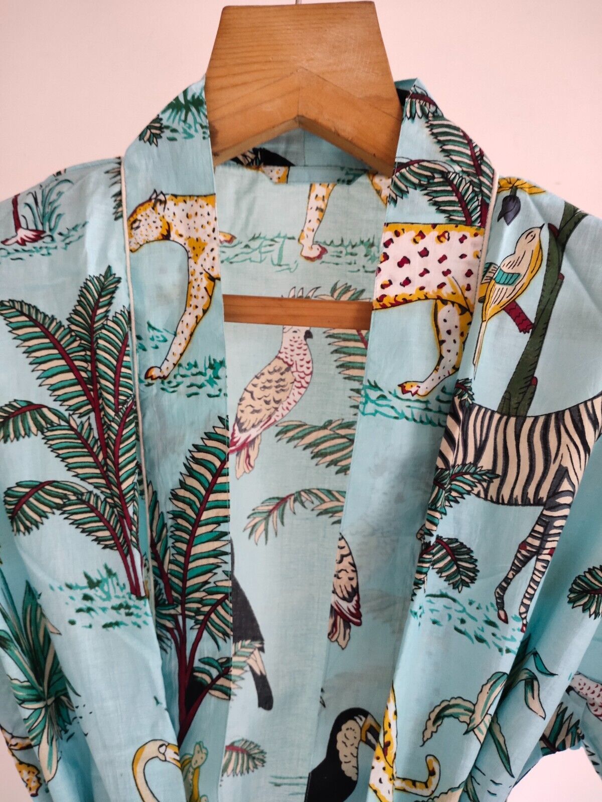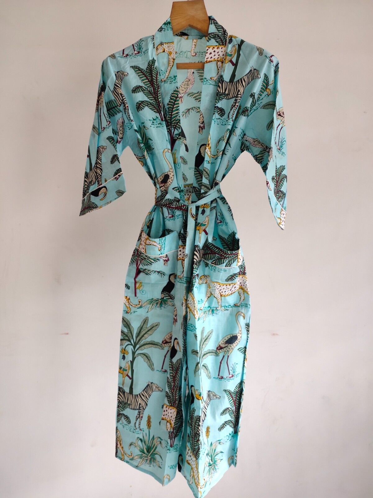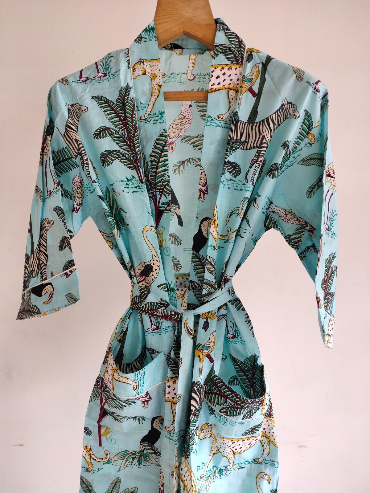 Sky Blue Safari Print Cotton Kimono Robes for Women Indian Dressing Gown Unisex Beach Cover Bridesmaid Gifts