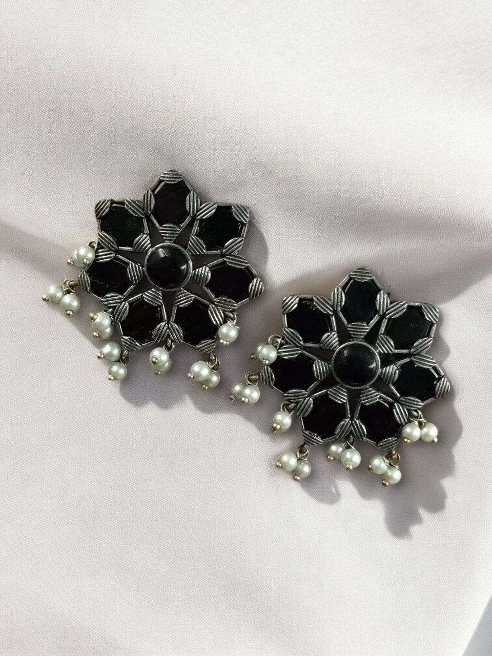 Dainty Round Star Stud Earring Special Ethnic Silver Oxidized Stone Work Tops Earrings