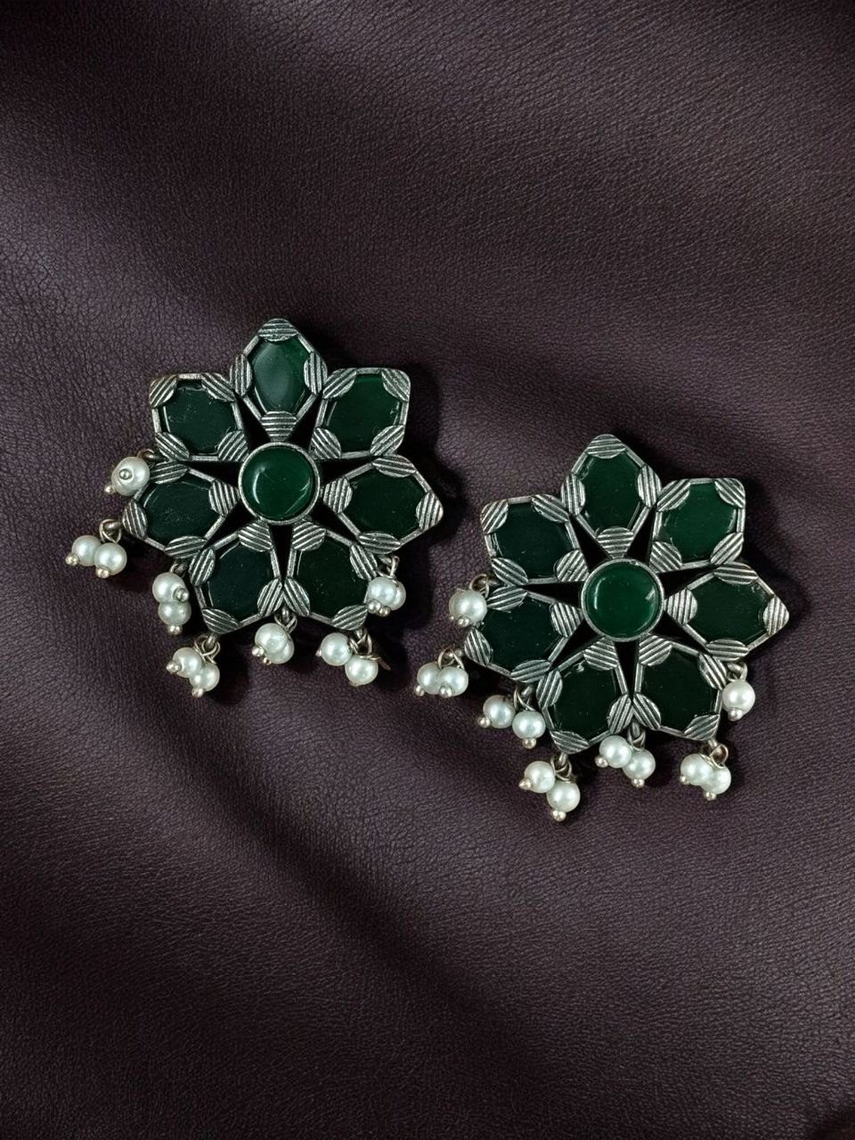 Green Dainty Round Star Stud Earring Special Ethnic Silver Oxidized Stone Work Tops Earrings