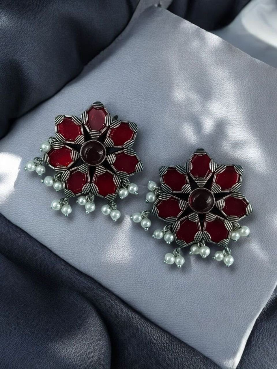 Red Dainty Round Star Stud Earring Special Ethnic Silver Oxidized Stone Work Tops Earrings