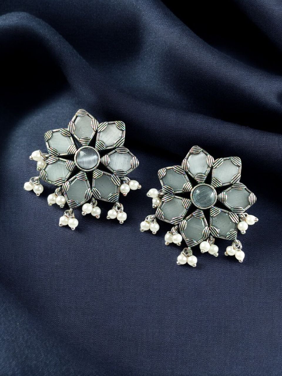 Grey Dainty Round Star Stud Earring Special Ethnic Silver Oxidized Stone Work Tops Earrings