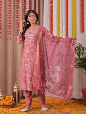 Pastel Pink Indian Floral Print Straight Embroidered Salwar Kameez Kurti Pant Dupatta Set - Set of 3