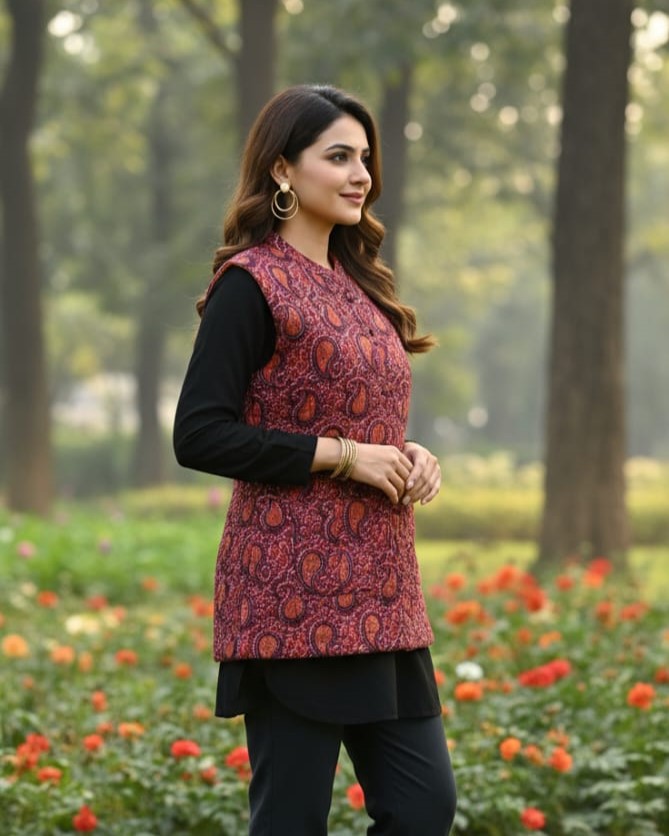 Elevate your ethnic style with this Red & Black Floral Printed Reversible Quilted Kantha Jacket. Crafted from soft, breathable cotton, it features intricate hand block prints and fine kantha stitching. The dual-side reversible design offers two stylish looks in one-perfect for layering over kurtas or dresses. Sleeveless and lightweight, this jacket blends traditional craftsmanship with modern versatility, ideal for year-round wear.