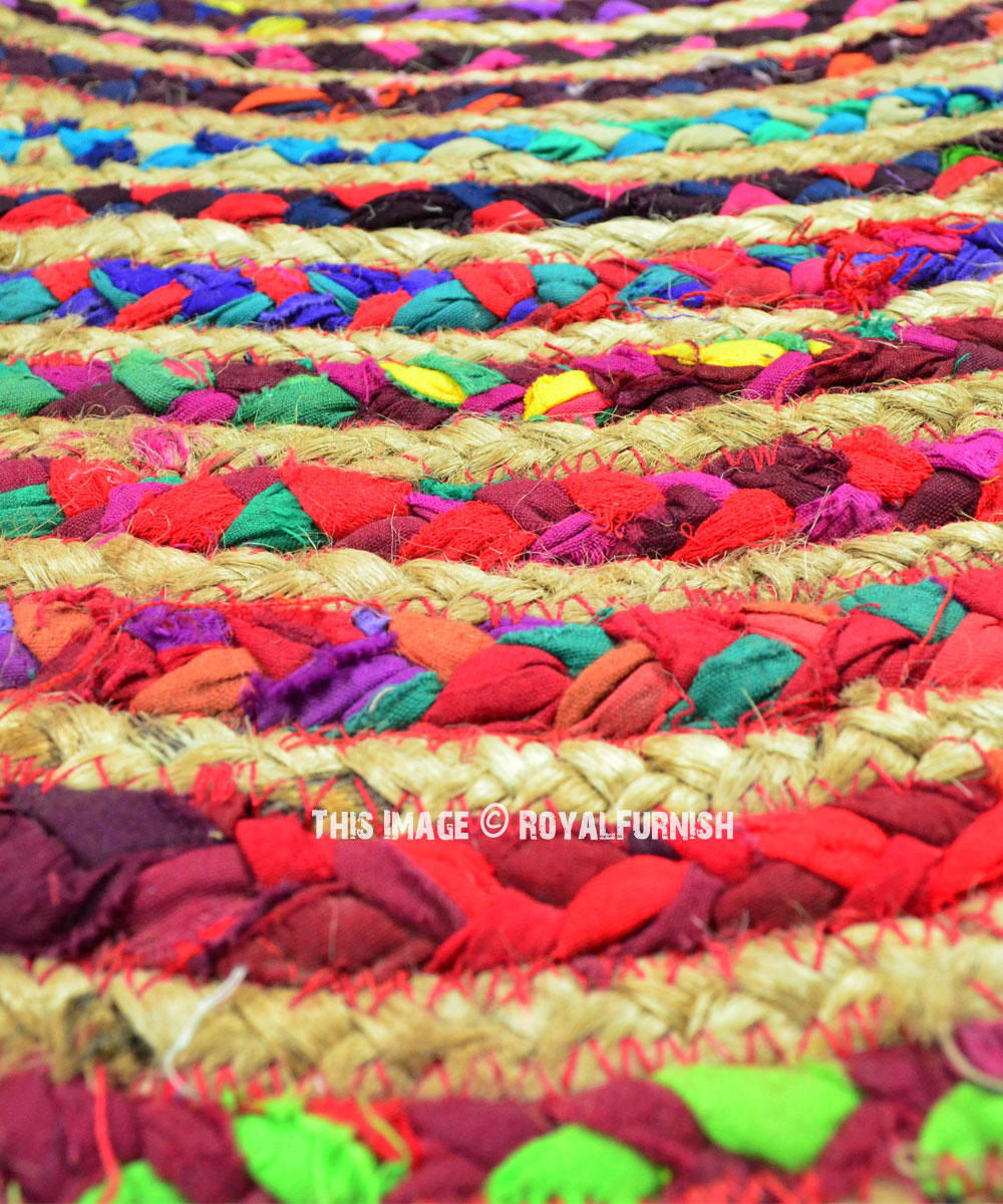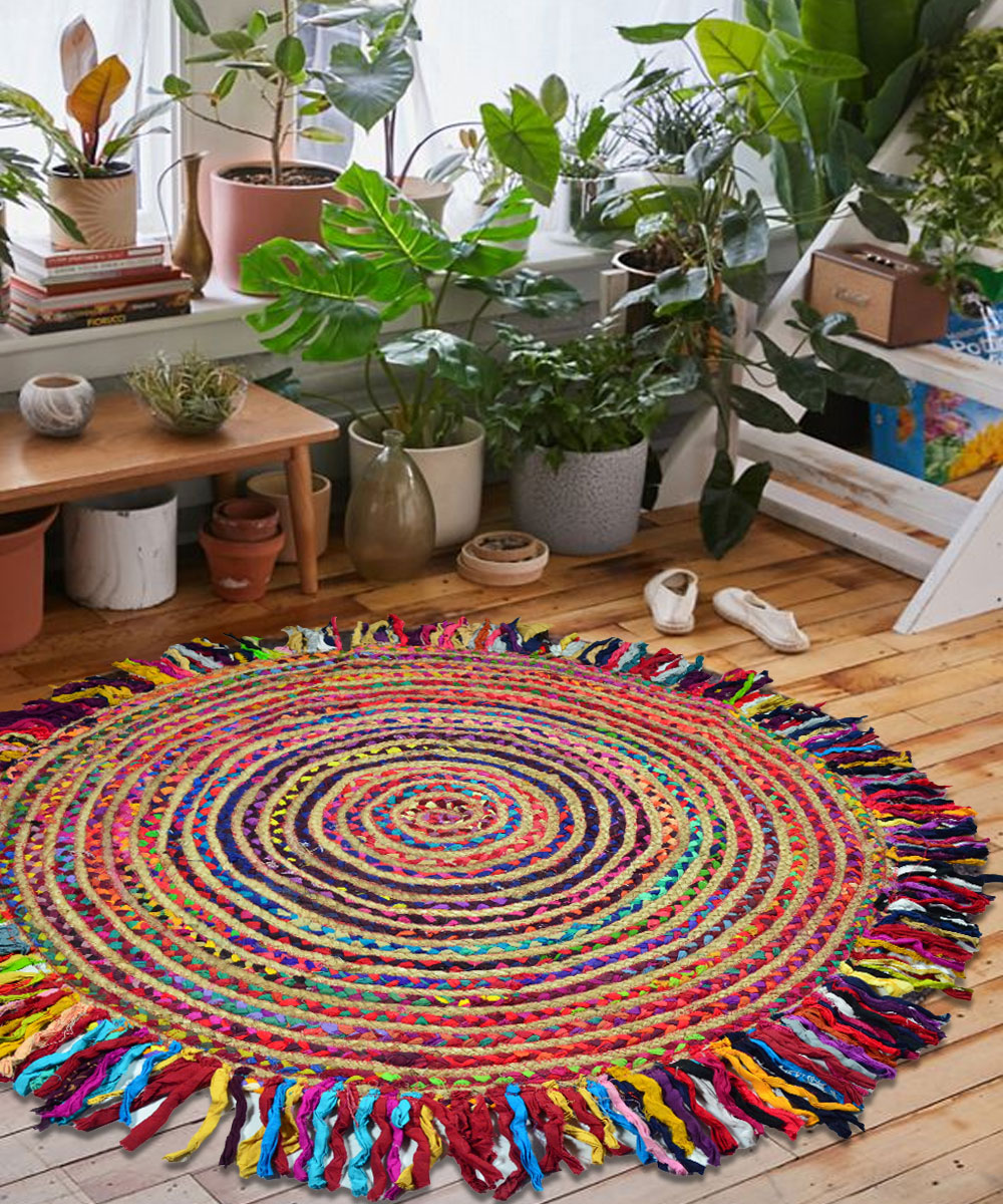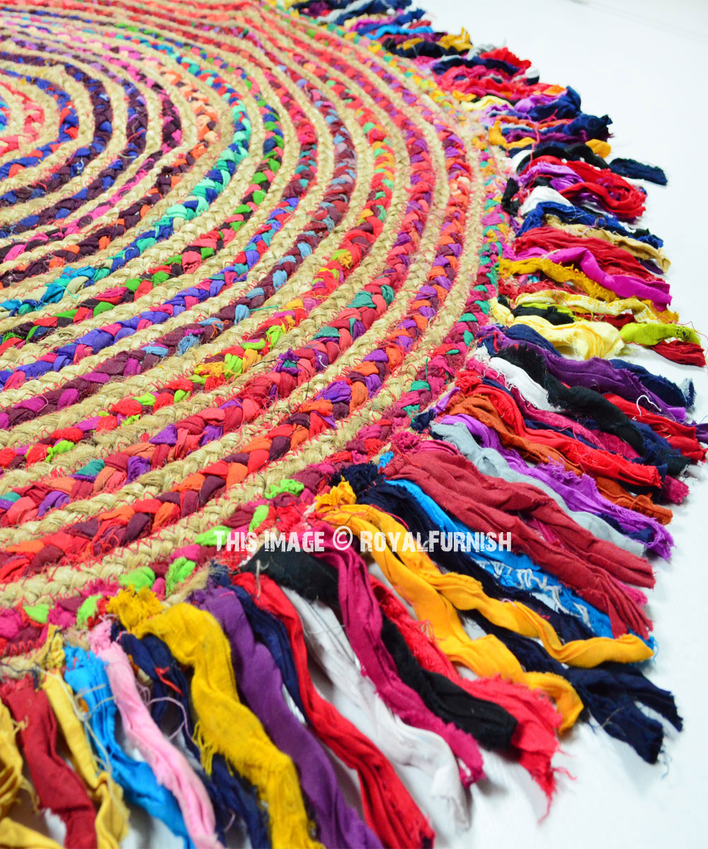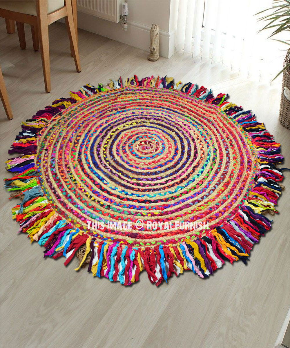 Boho Indian Handmade Jute & Cotton Braided Rugs Colorful Fringed Chindi Round Rug - 4 Ft