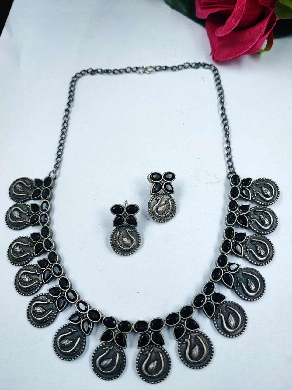 Black Traditional Stonework Indian Peacock Designer Choker Silver Oxidized Necklace with Earrings