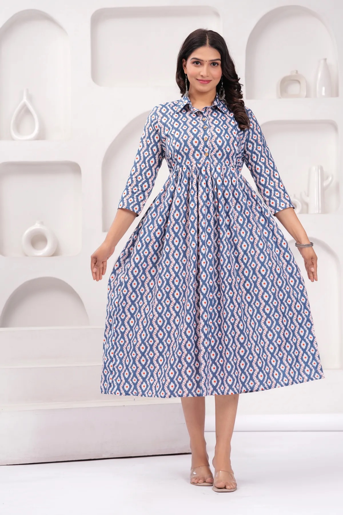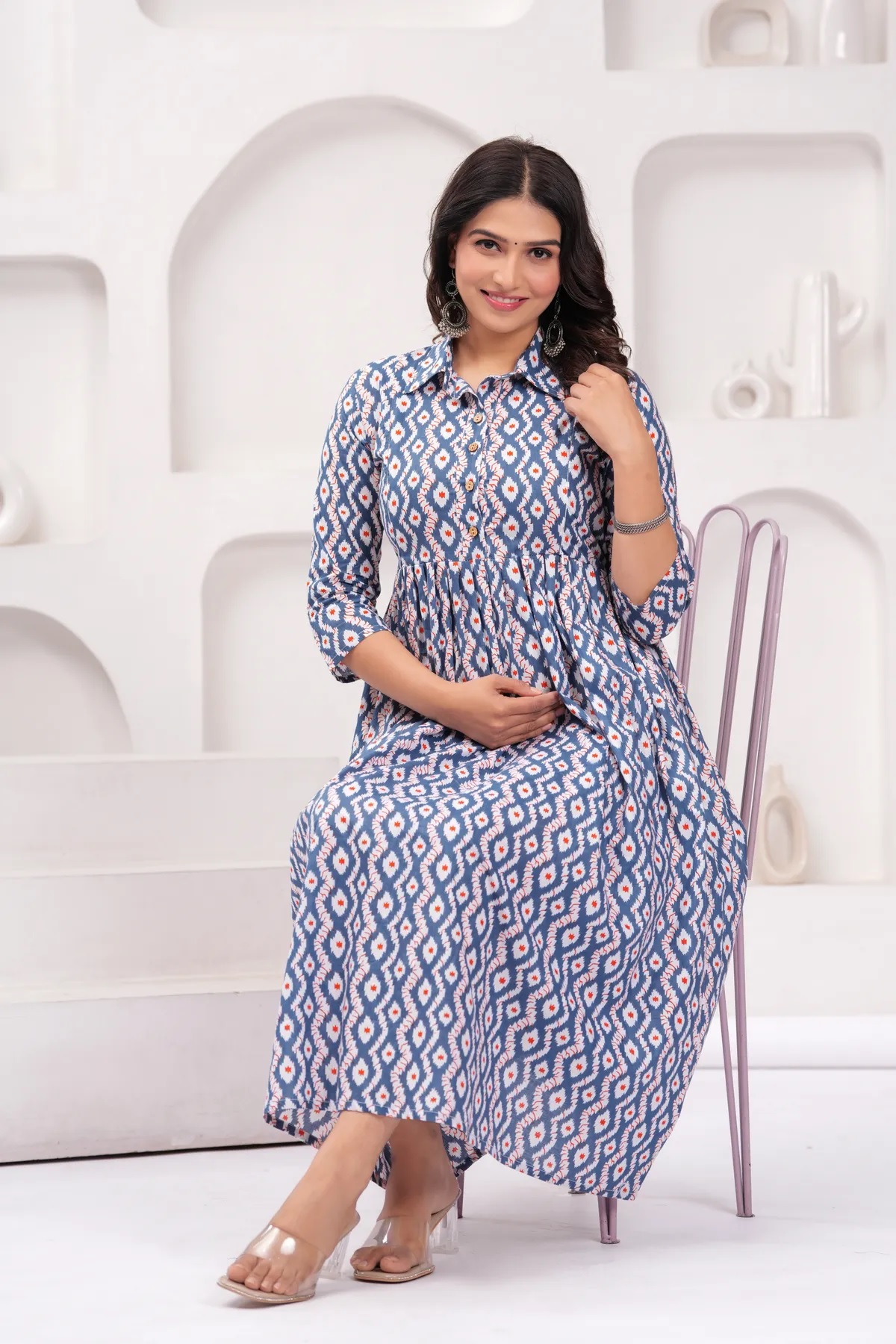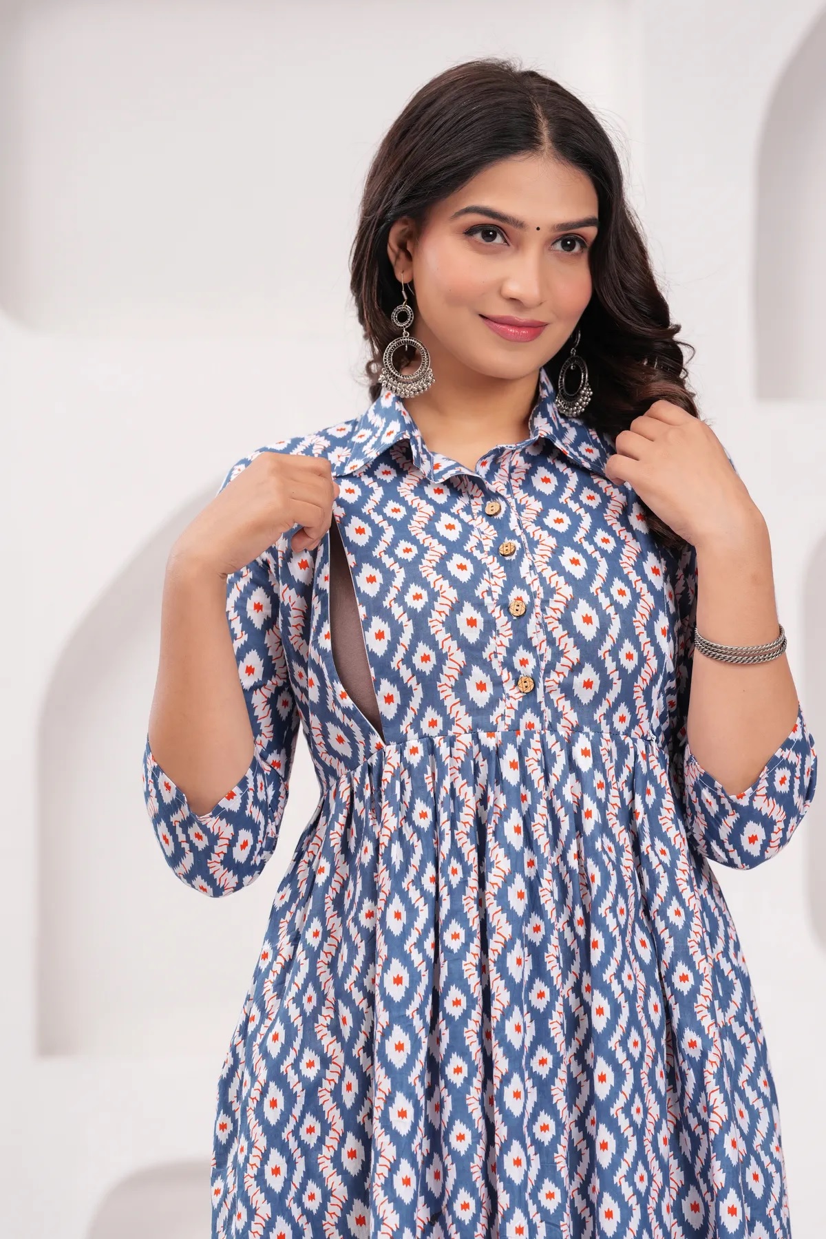 Blue Cream Baby Feeding Gown Printed Collared Maternity Kurta Anarkali Kurti with Hidden Feeding Zip
