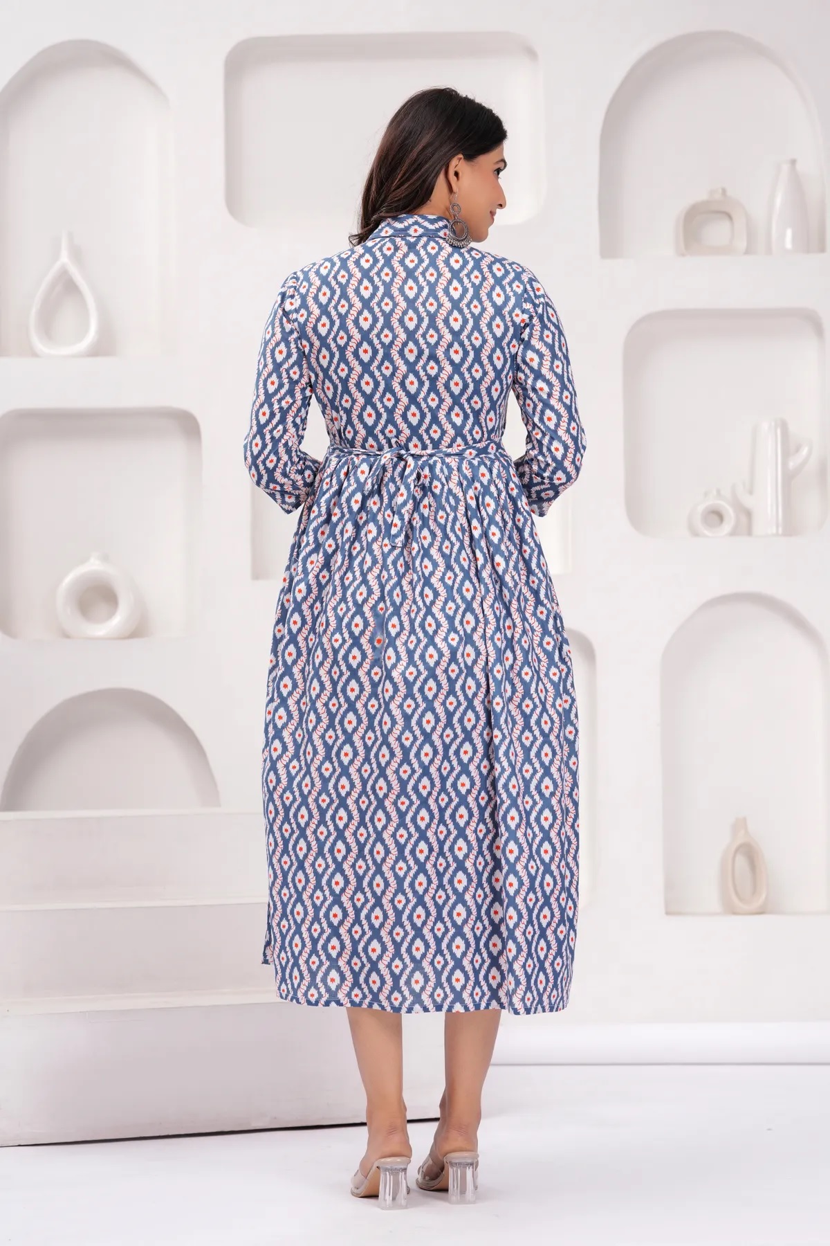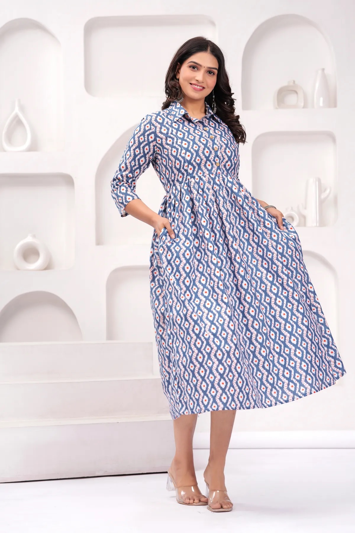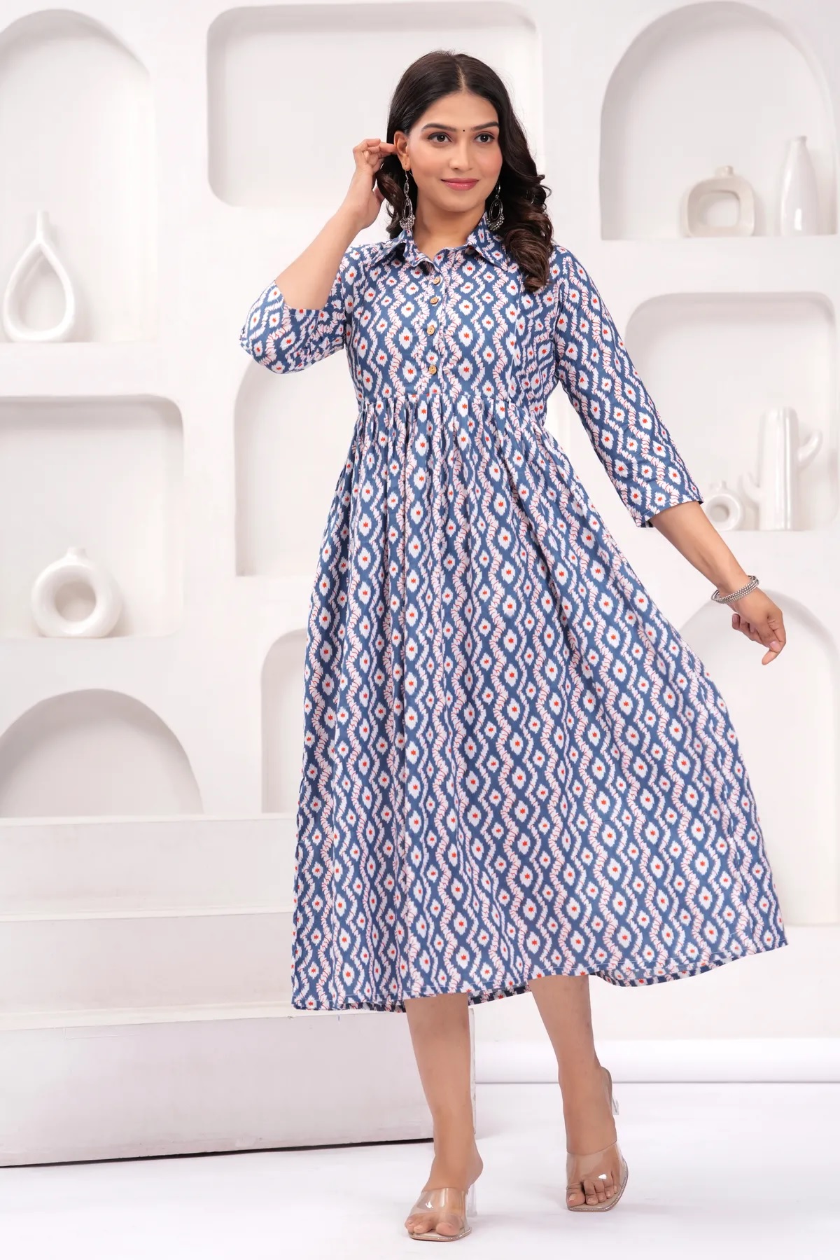 Blue Cream Baby Feeding Gown Printed Collared Maternity Kurta Anarkali Kurti with Hidden Feeding Zip