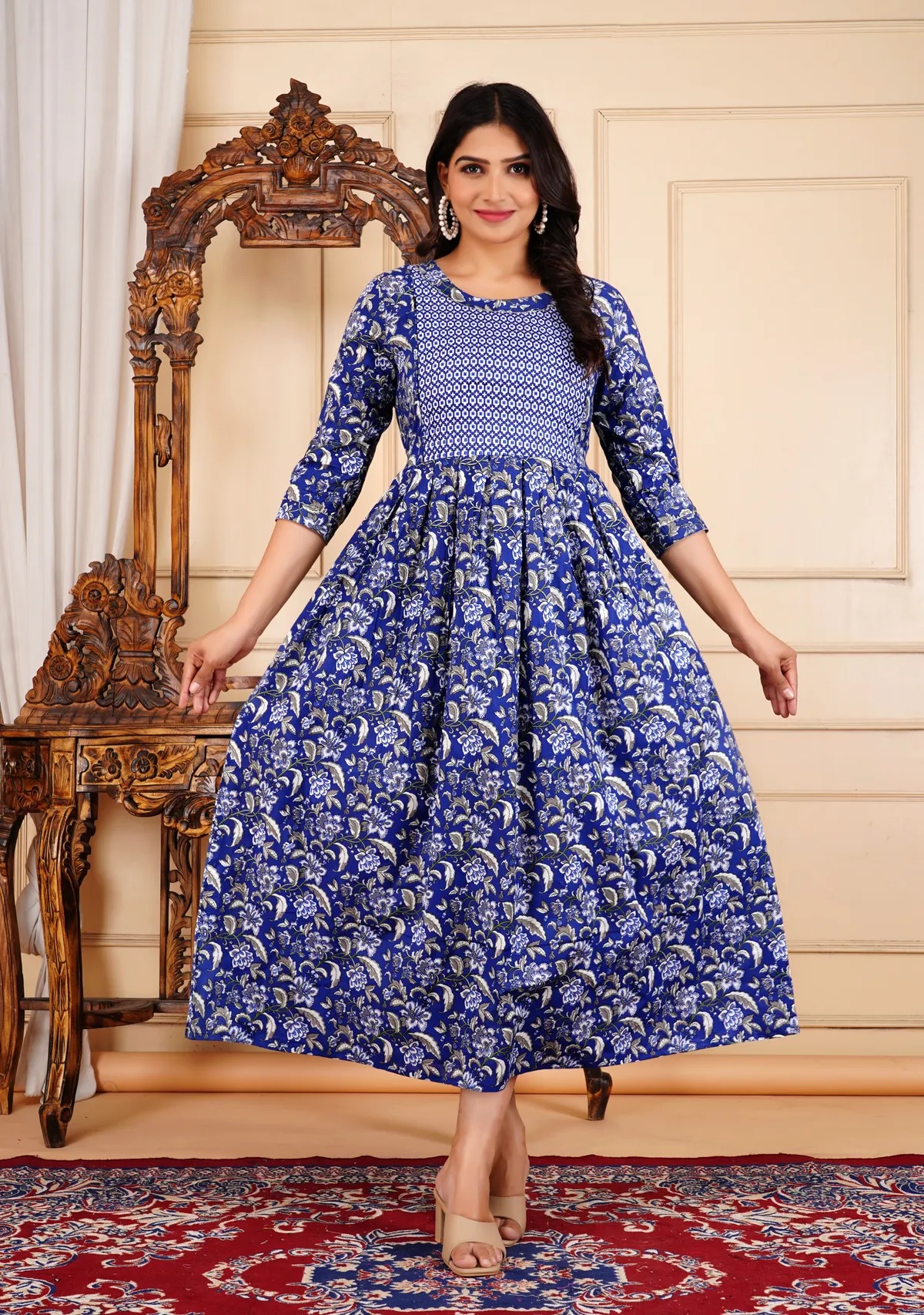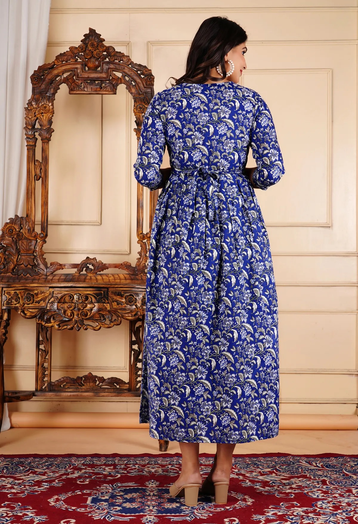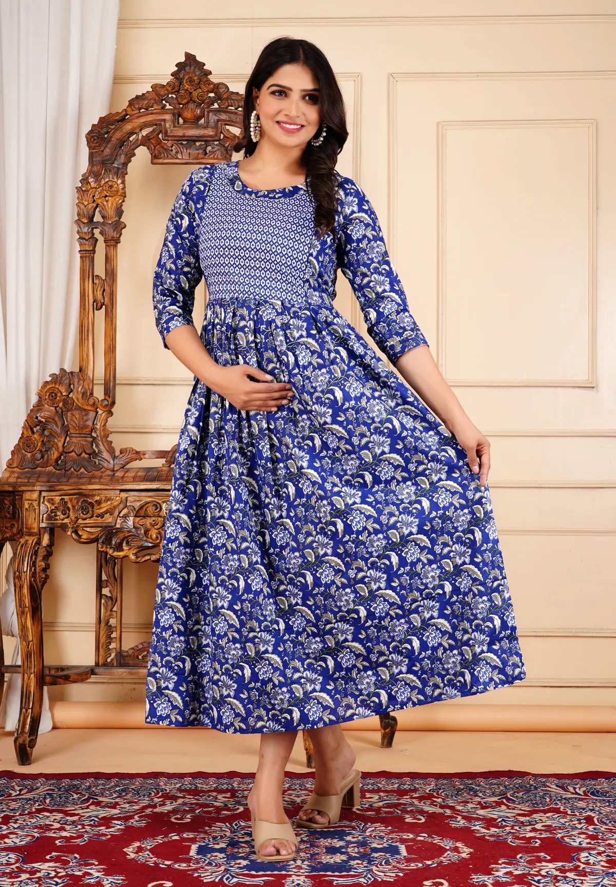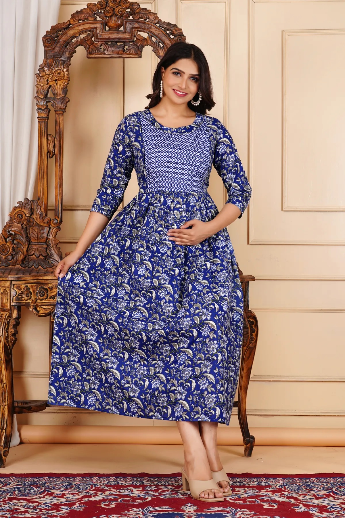 Royal Blue Baby Feeding Gown Printed Maternity Kurta Anarkali Kurti with Hidden Feeding Zip