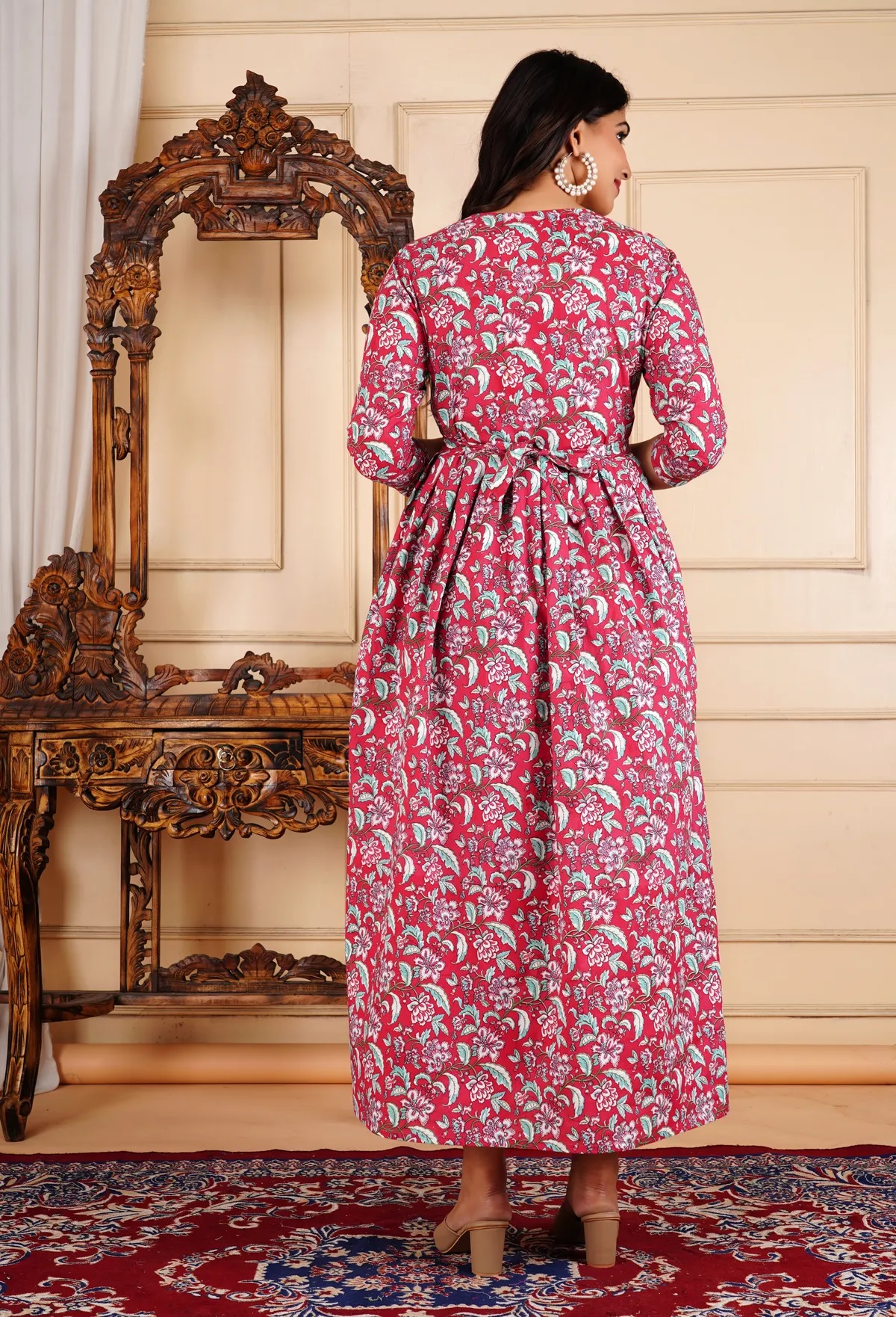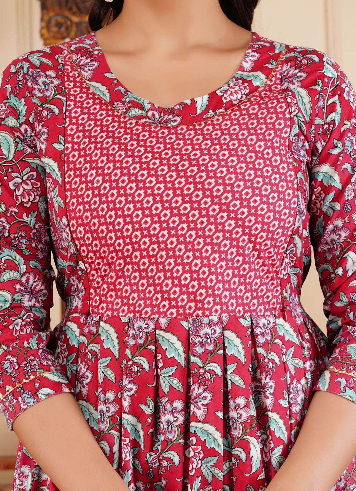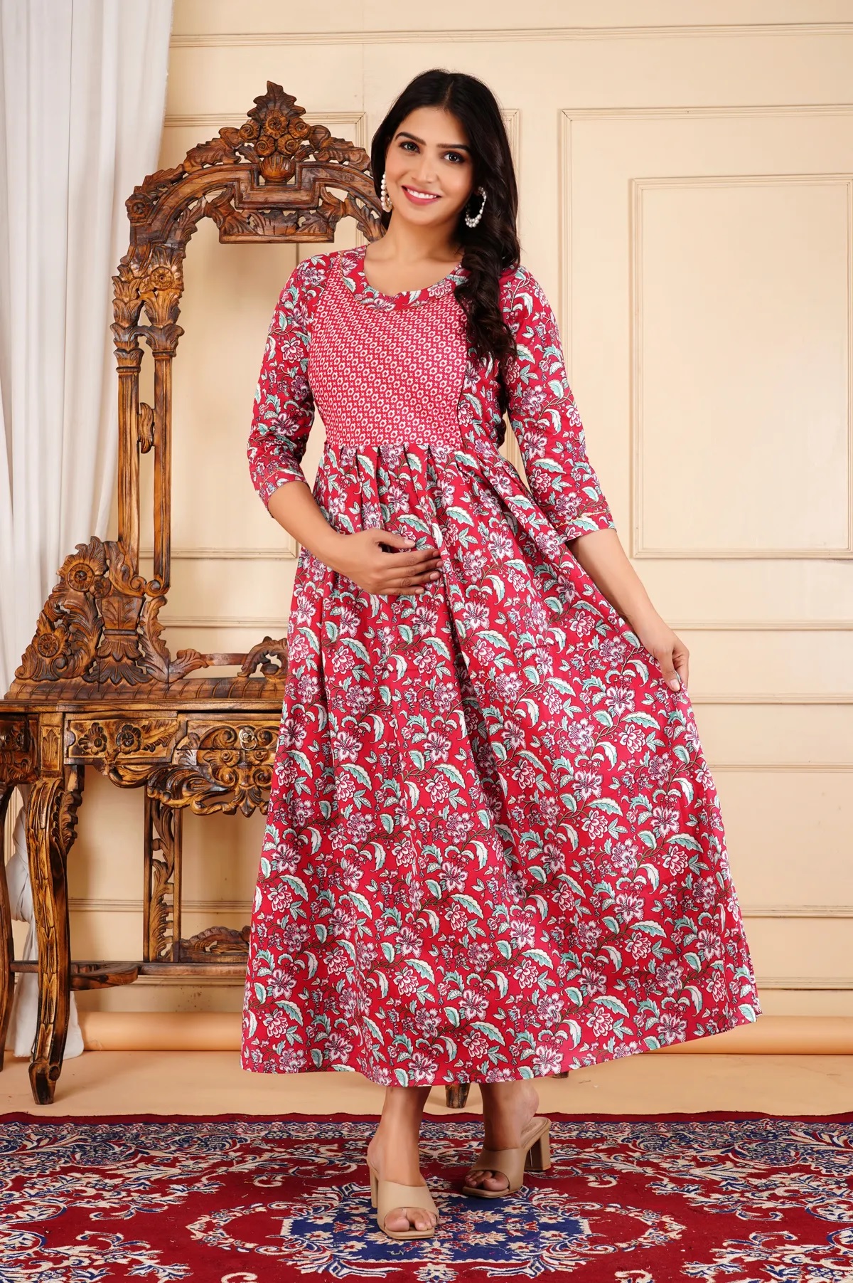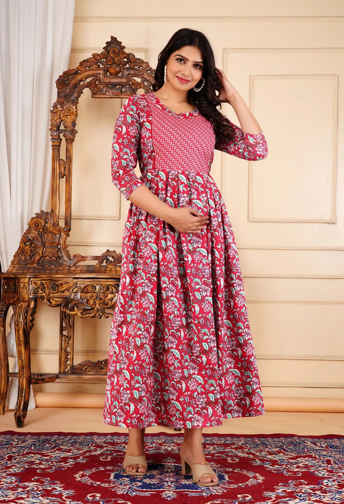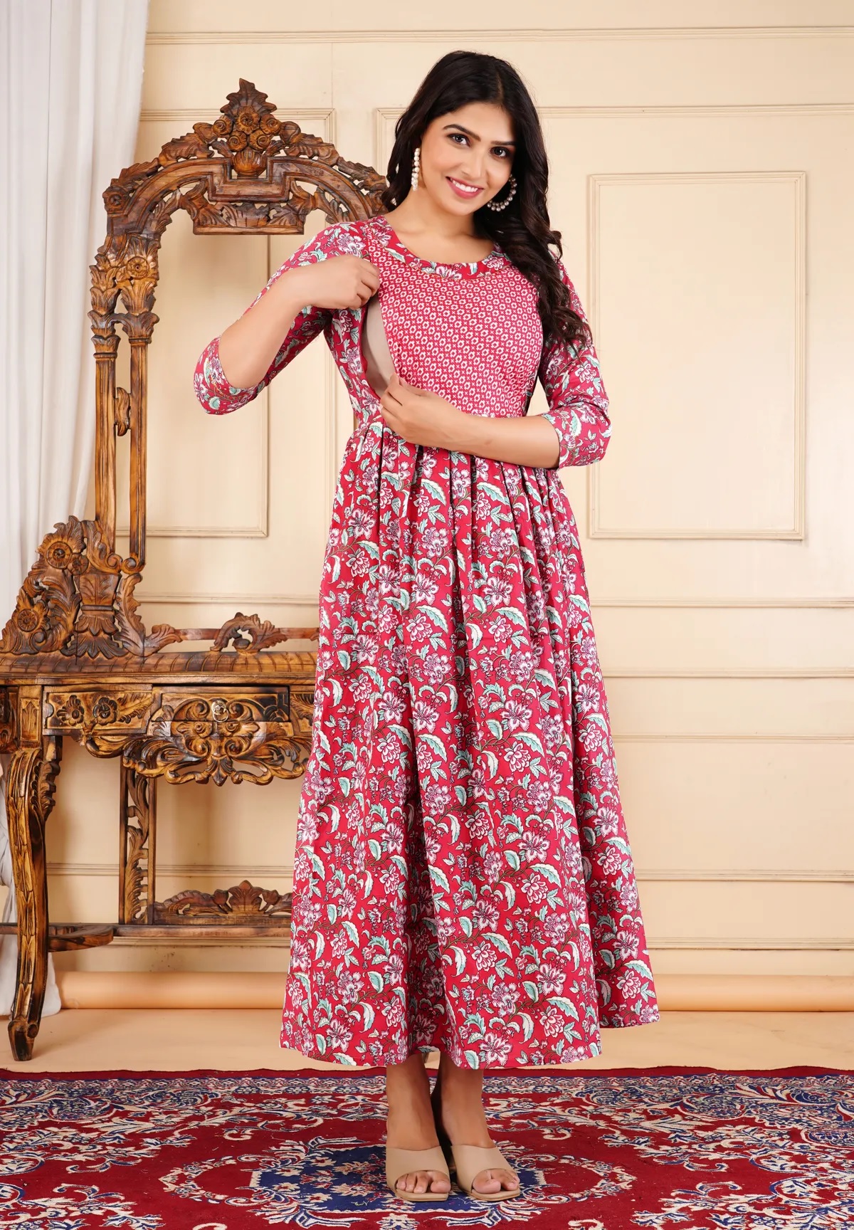 Red Baby Feeding Gown Floral Printed Maternity Kurta Anarkali Kurti with Hidden Feeding Zip