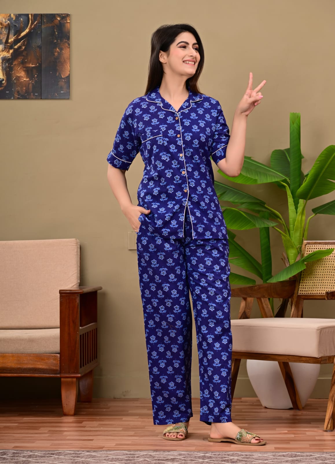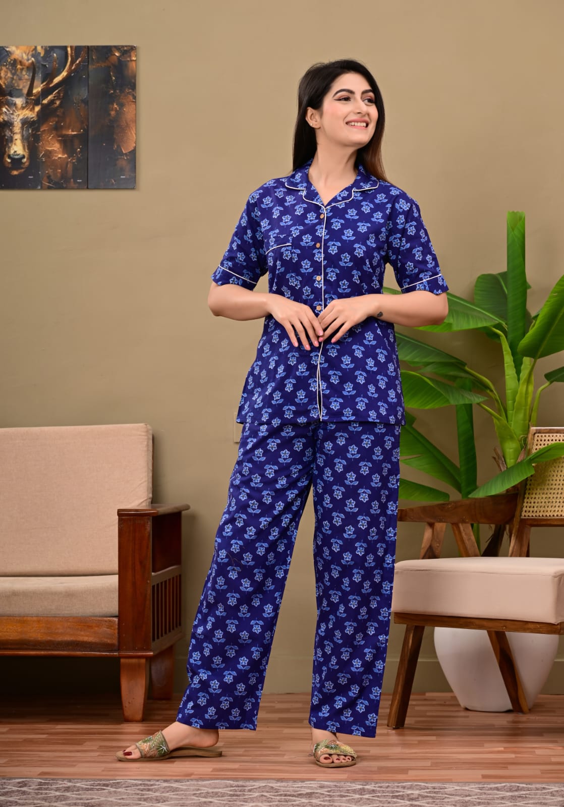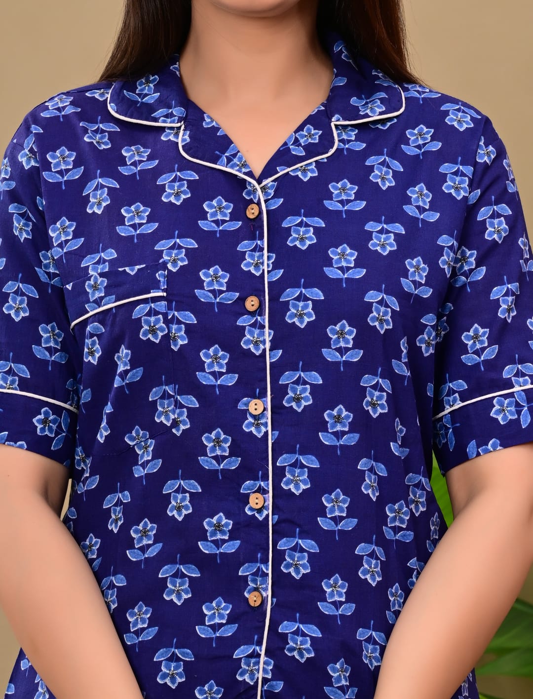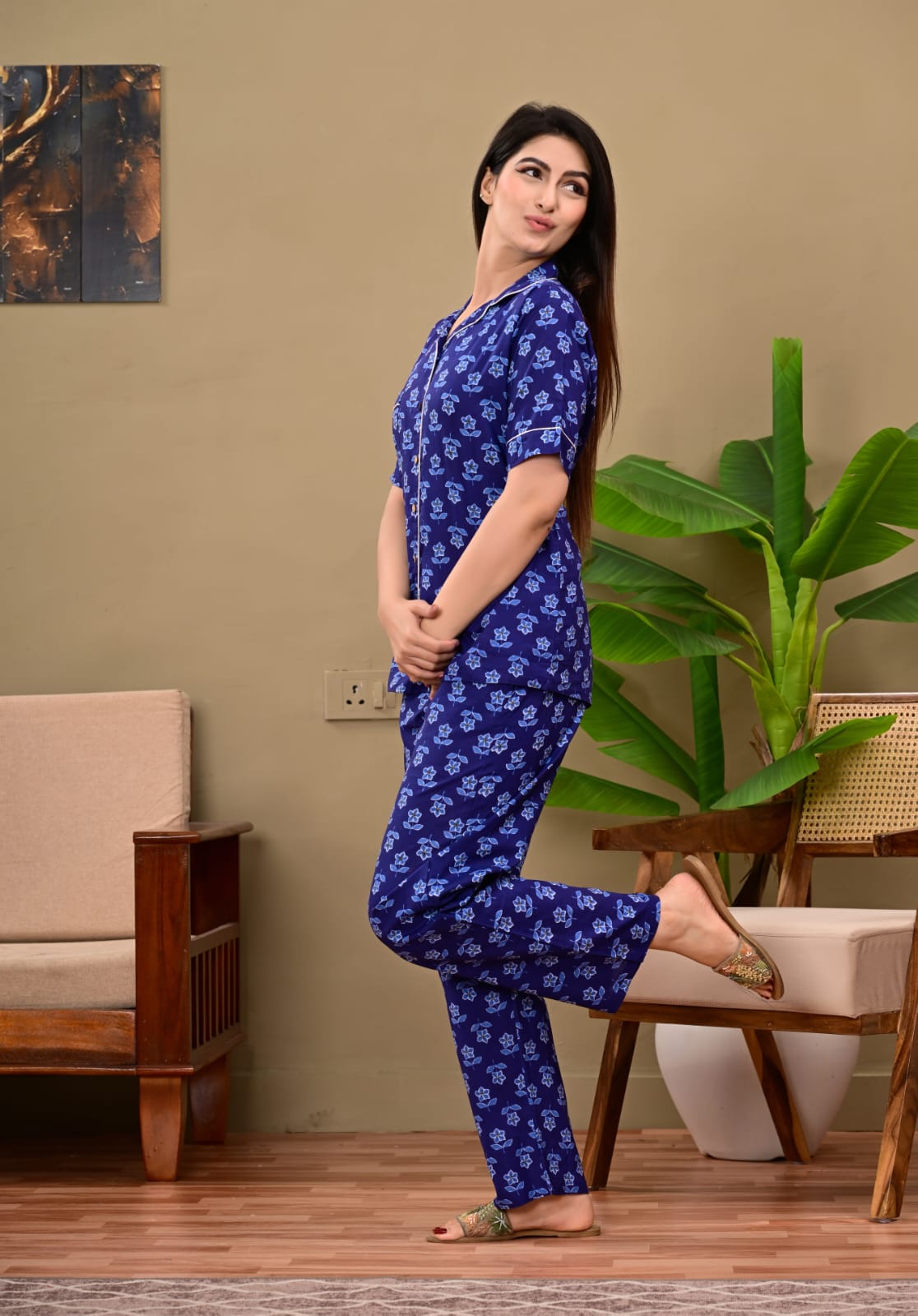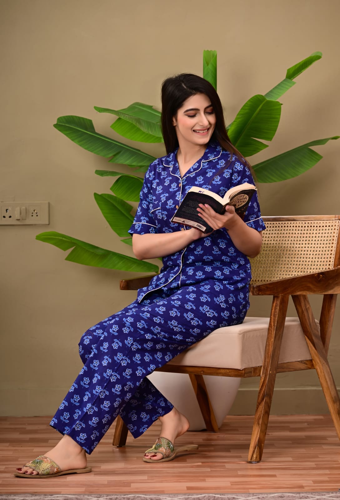 Upgrade your bedtime wardrobe with our Blue Floral Print Lounge Wear Set. This night suit features an elegant floral print and is crafted for utmost comfort and style. The matching pyjama co-ord set ensures a cohesive, chic look while lounging or sleeping. Made from soft, breathable fabric, it's perfect for a restful night's sleep. Ideal for women who appreciate both comfort and fashion, this lounge wear set is a must-have for any nightwear collection. 😴🌸