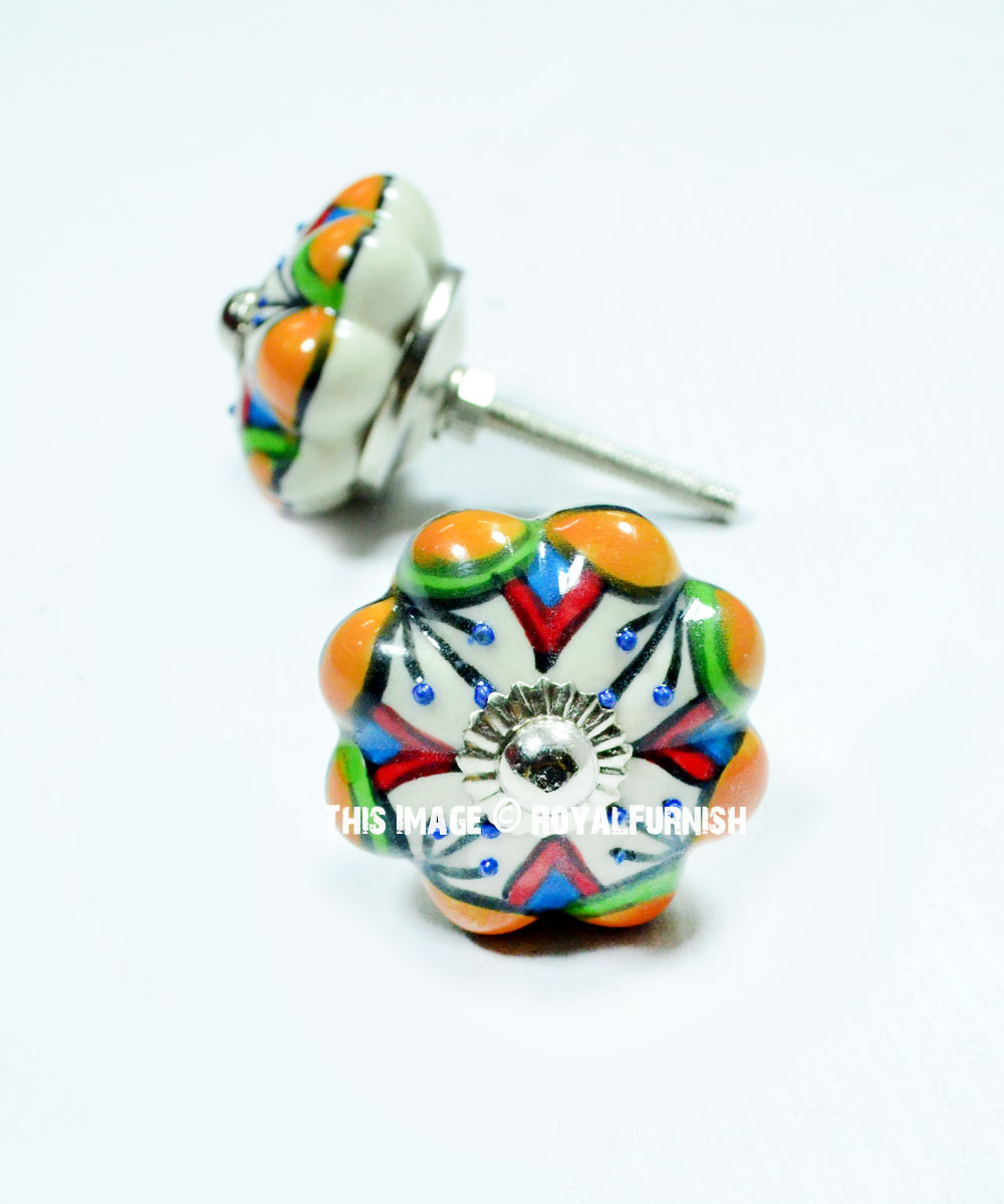 Design 4 Multi Colorful Flower Hand Painted Decorative Indian Ceramic Drawer Knobs, Set of 2
