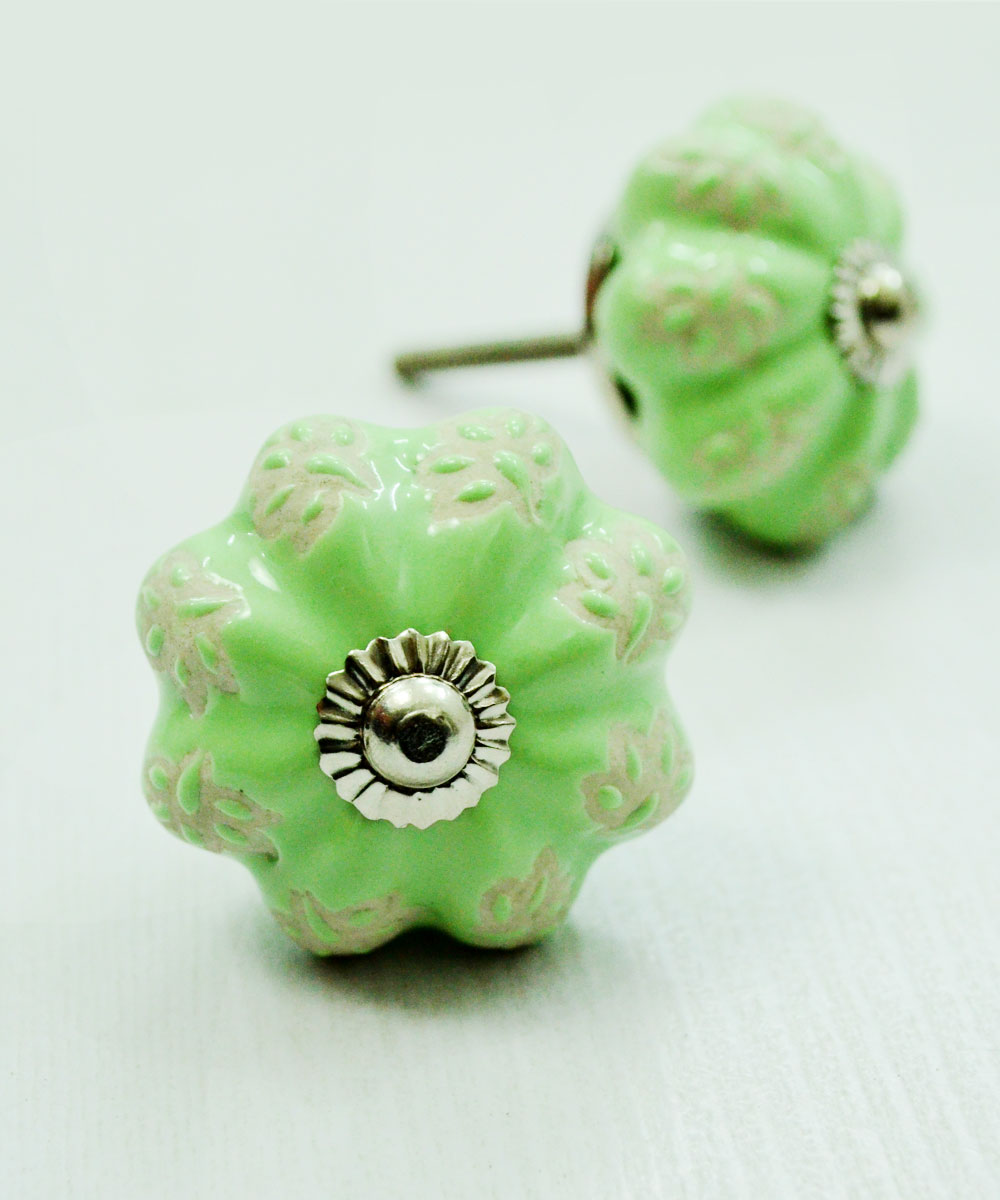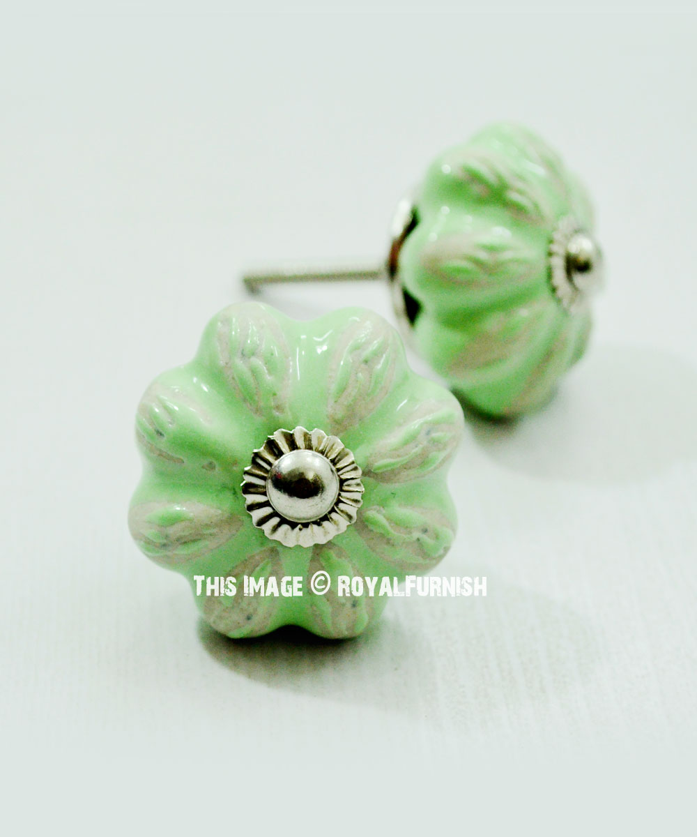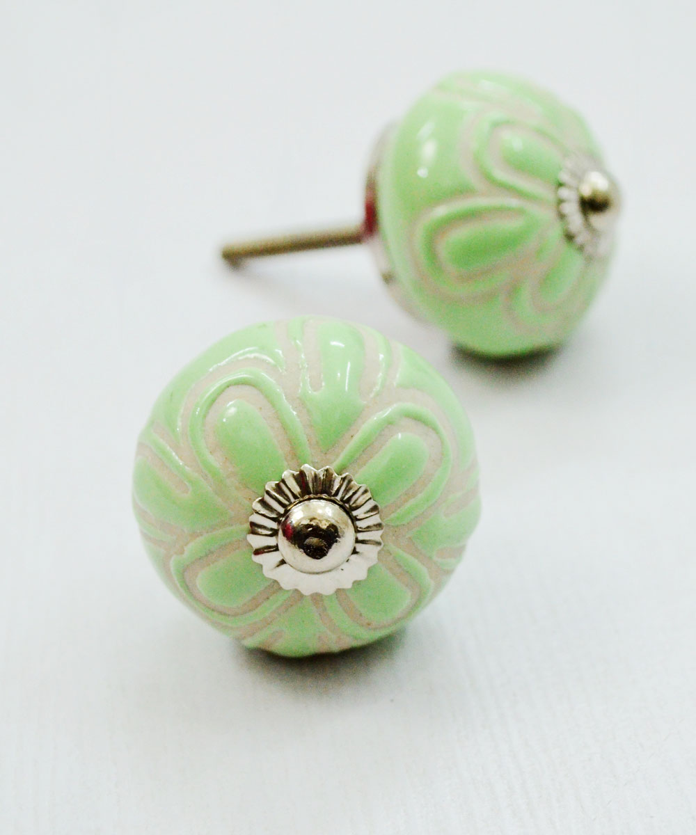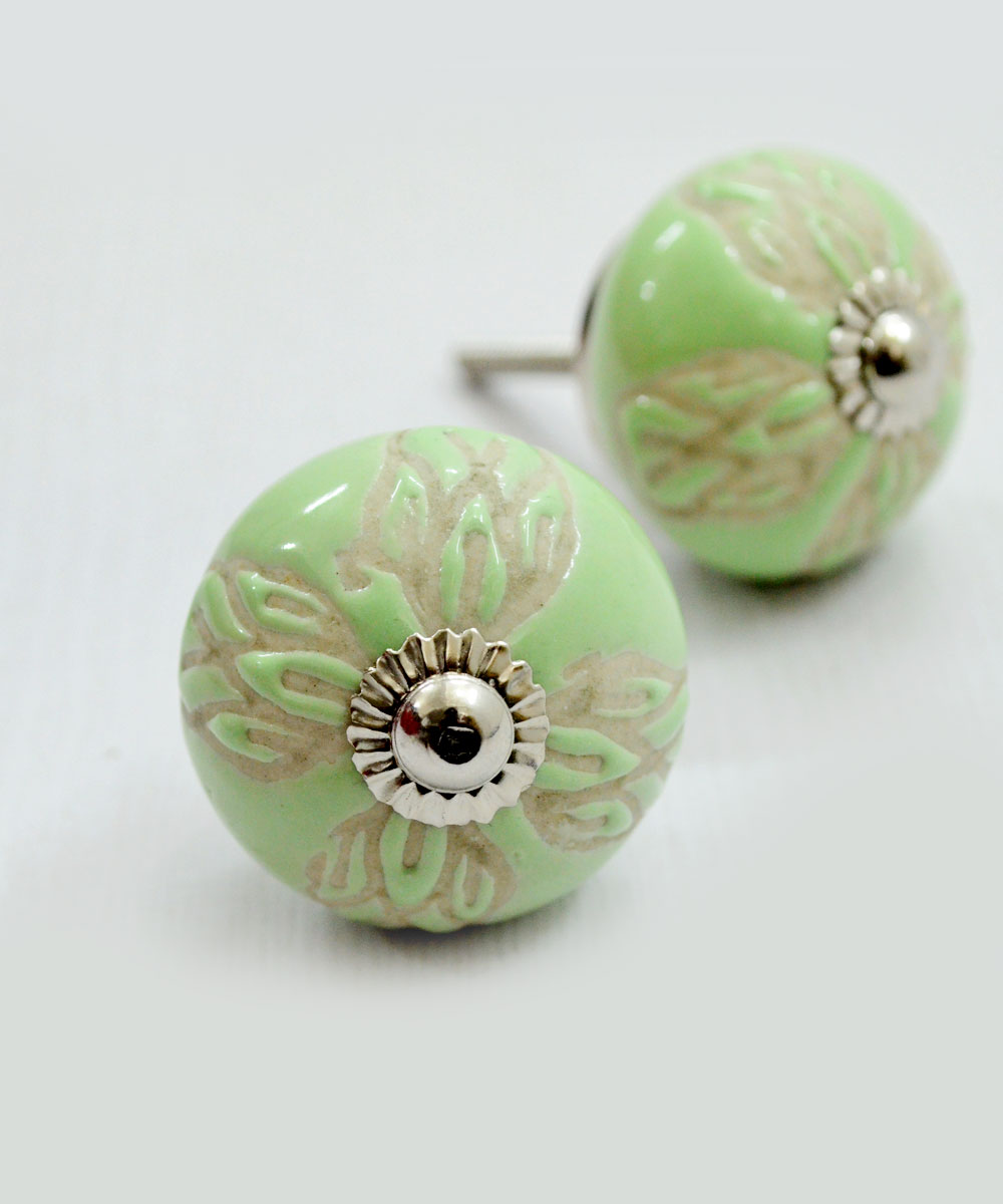 Green Shabby Chic Decorative Indian Glossy Ceramic Cabinet Knob Set of Two