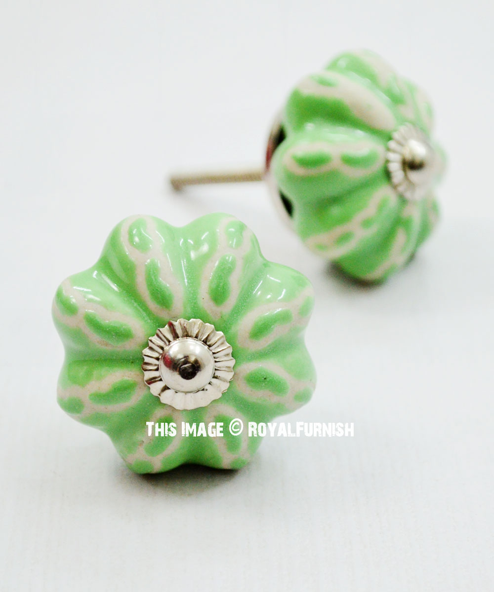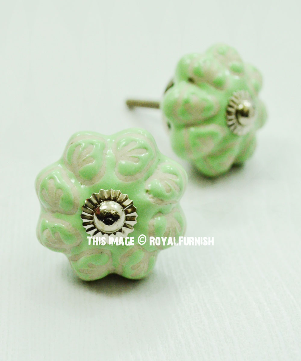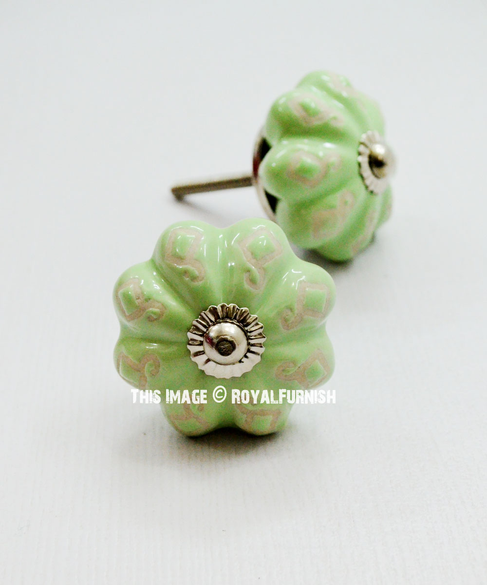 Design 6 Green Shabby Chic Decorative Indian Glossy Ceramic Cabinet Knob Set of Two
