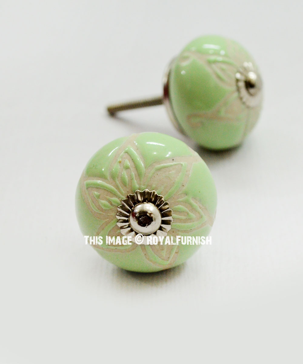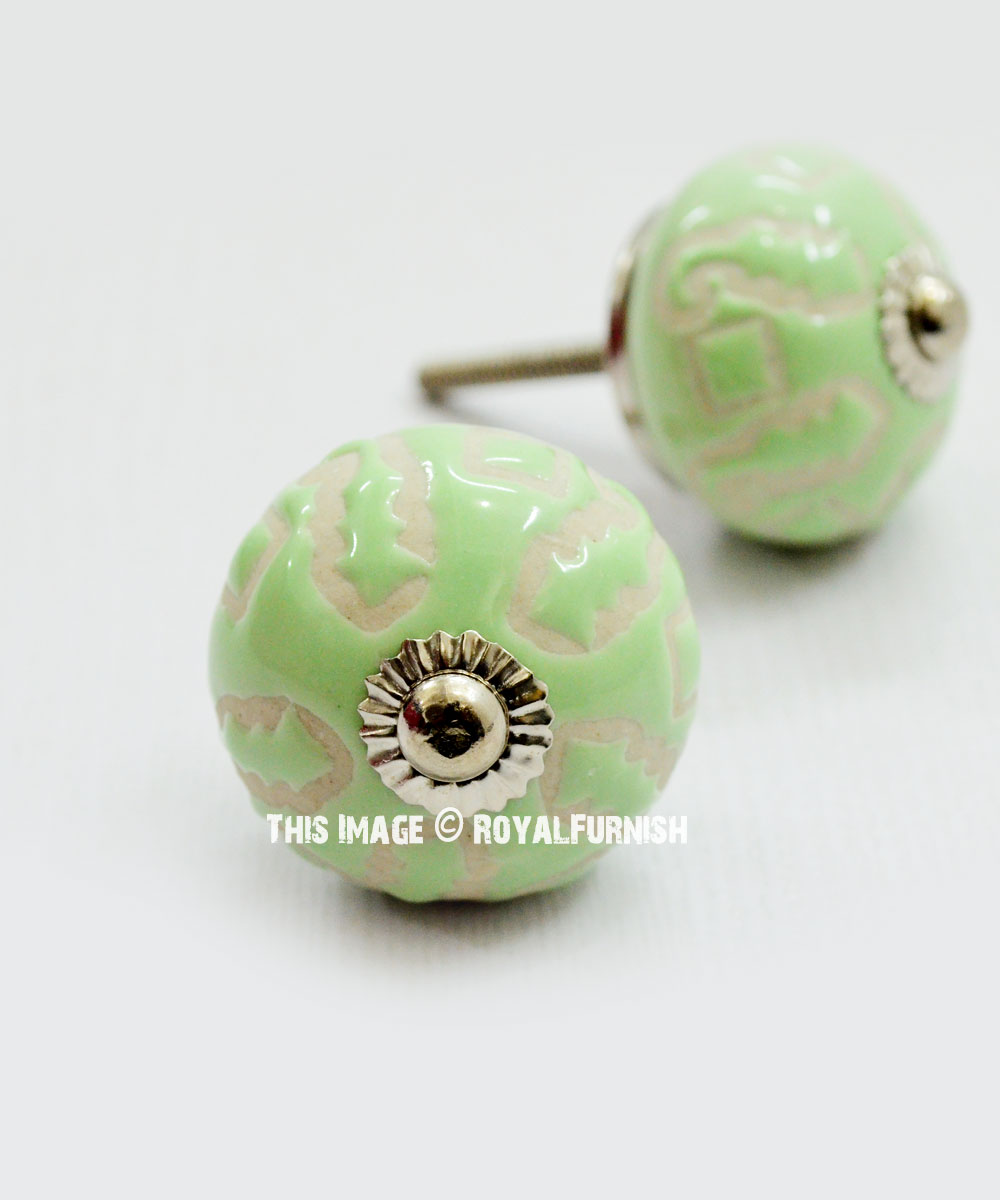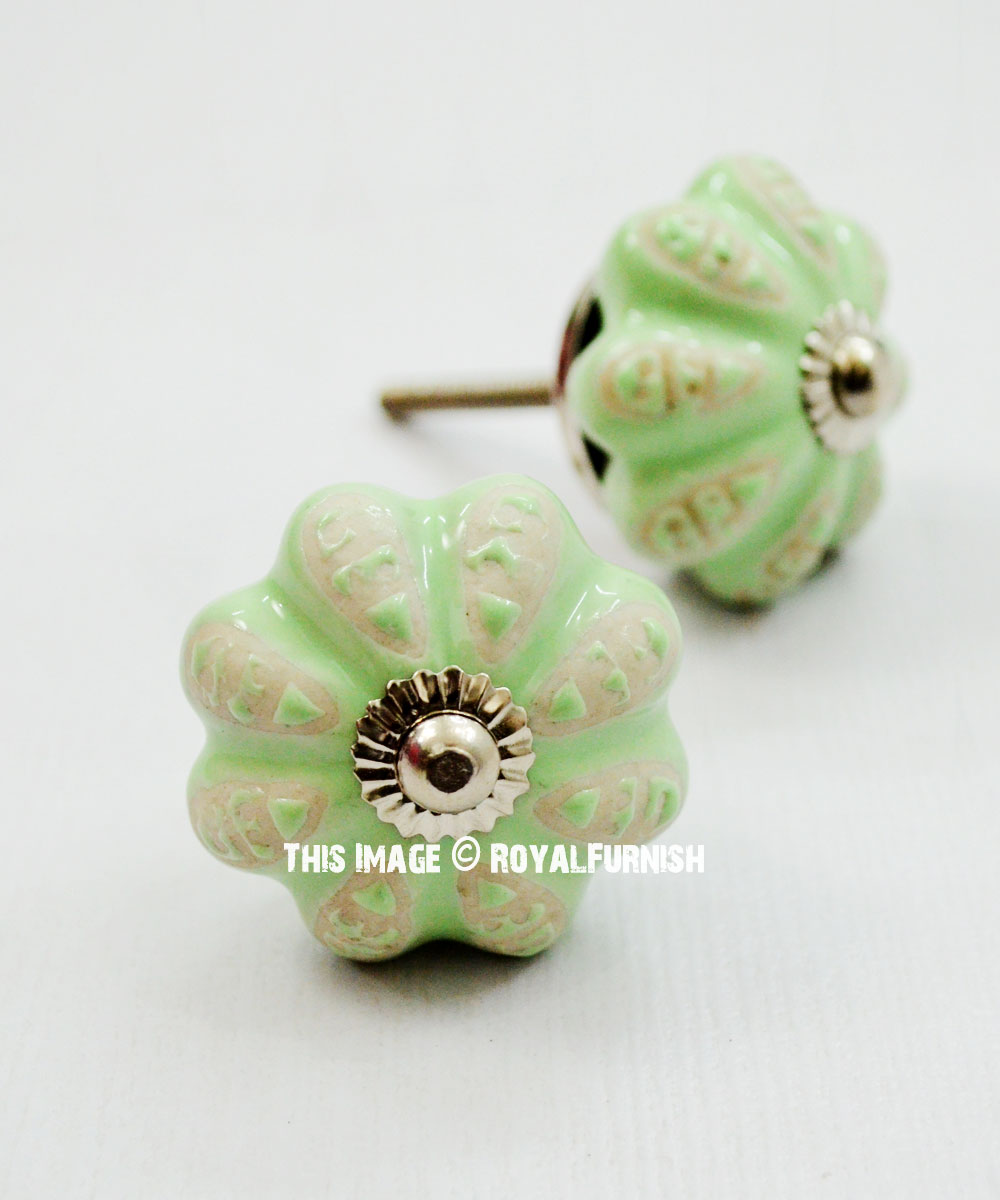 Design 6 Green Shabby Chic Decorative Indian Glossy Ceramic Cabinet Knob Set of Two