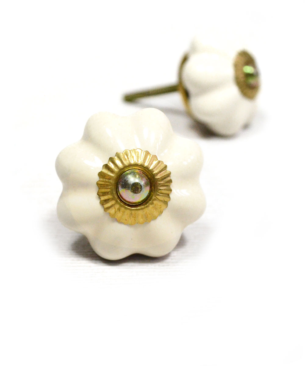 Off White Solid Flower Shaped Decorative Glossy Ceramic Cabinet Knob Set of Two