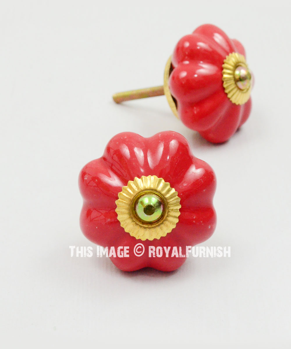 Red Solid Flower Shaped Decorative Glossy Ceramic Cabinet Knob Set of Two
