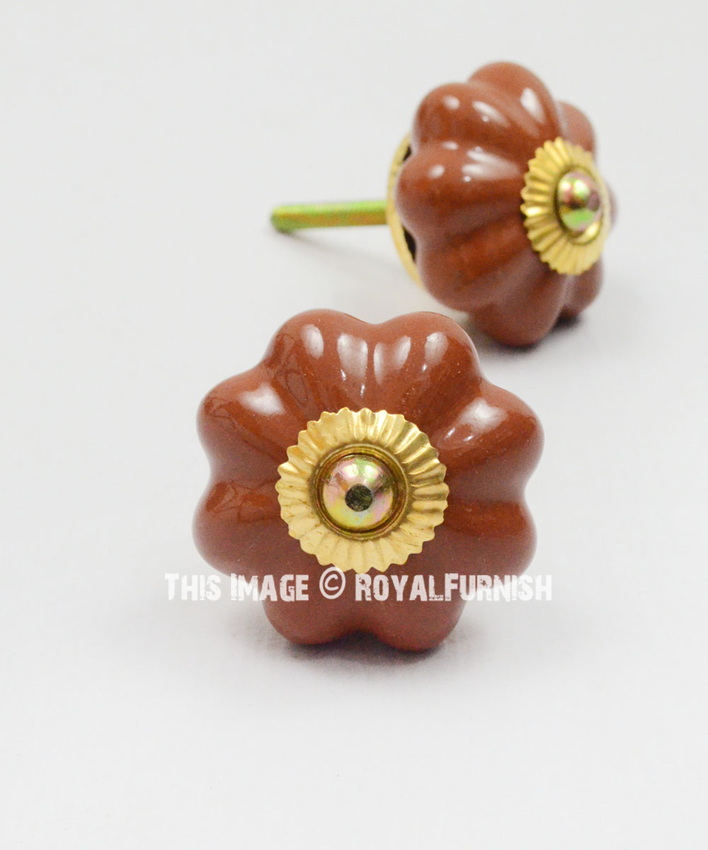 Brown Solid Flower Shaped Decorative Glossy Ceramic Cabinet Knob Set of Two