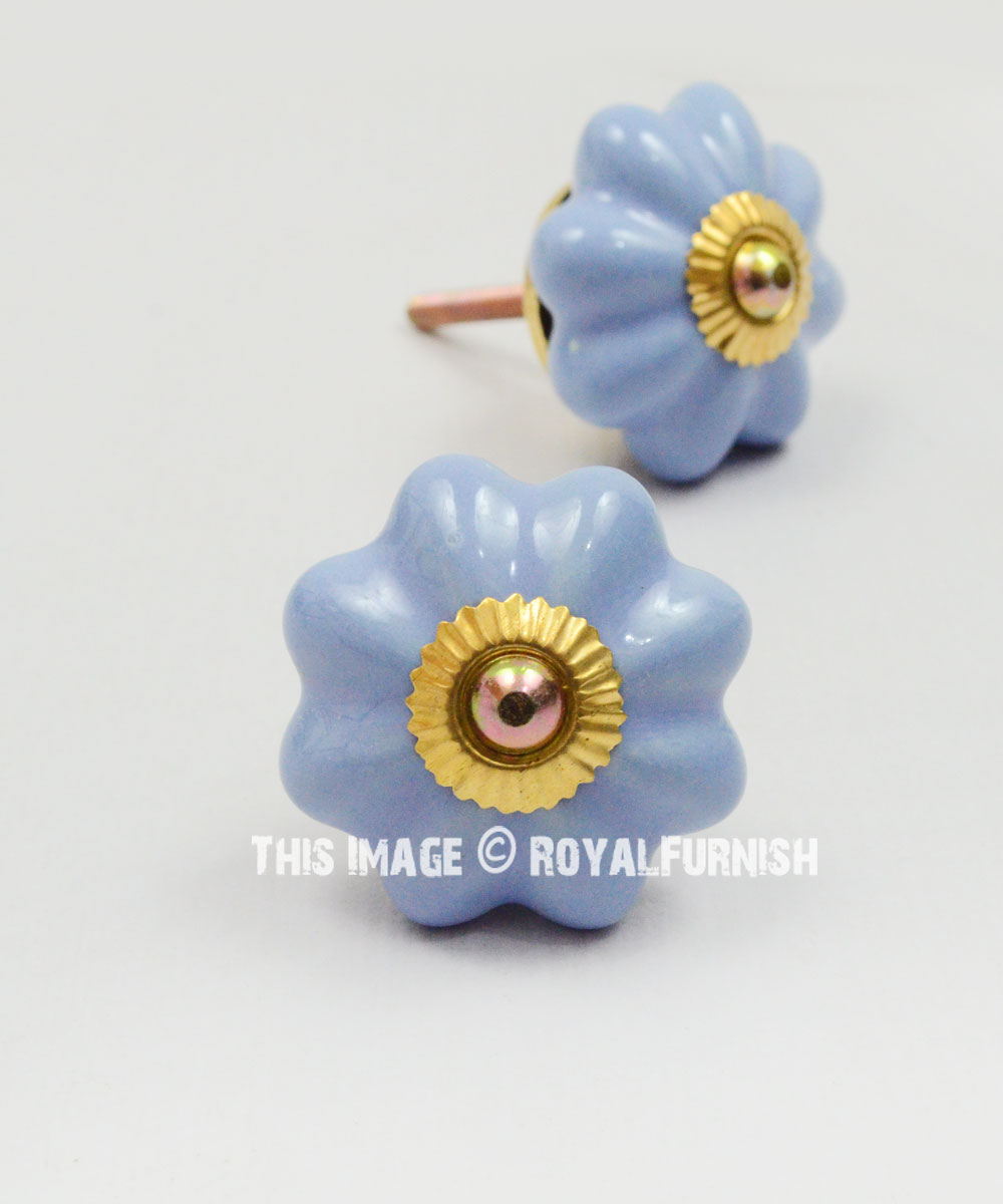 Blue Solid Flower Shaped Decorative Glossy Ceramic Cabinet Knob Set of Two