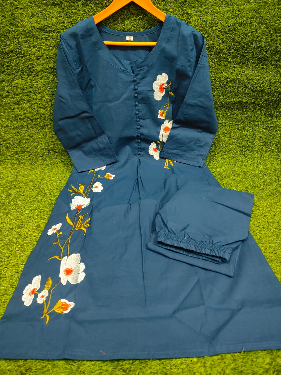 Blue Cotton Embroidered Straight Salwar Kameez Suit Dress Kurti Pant Co Ord Set