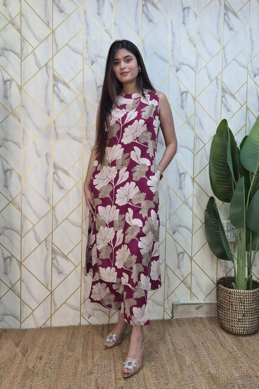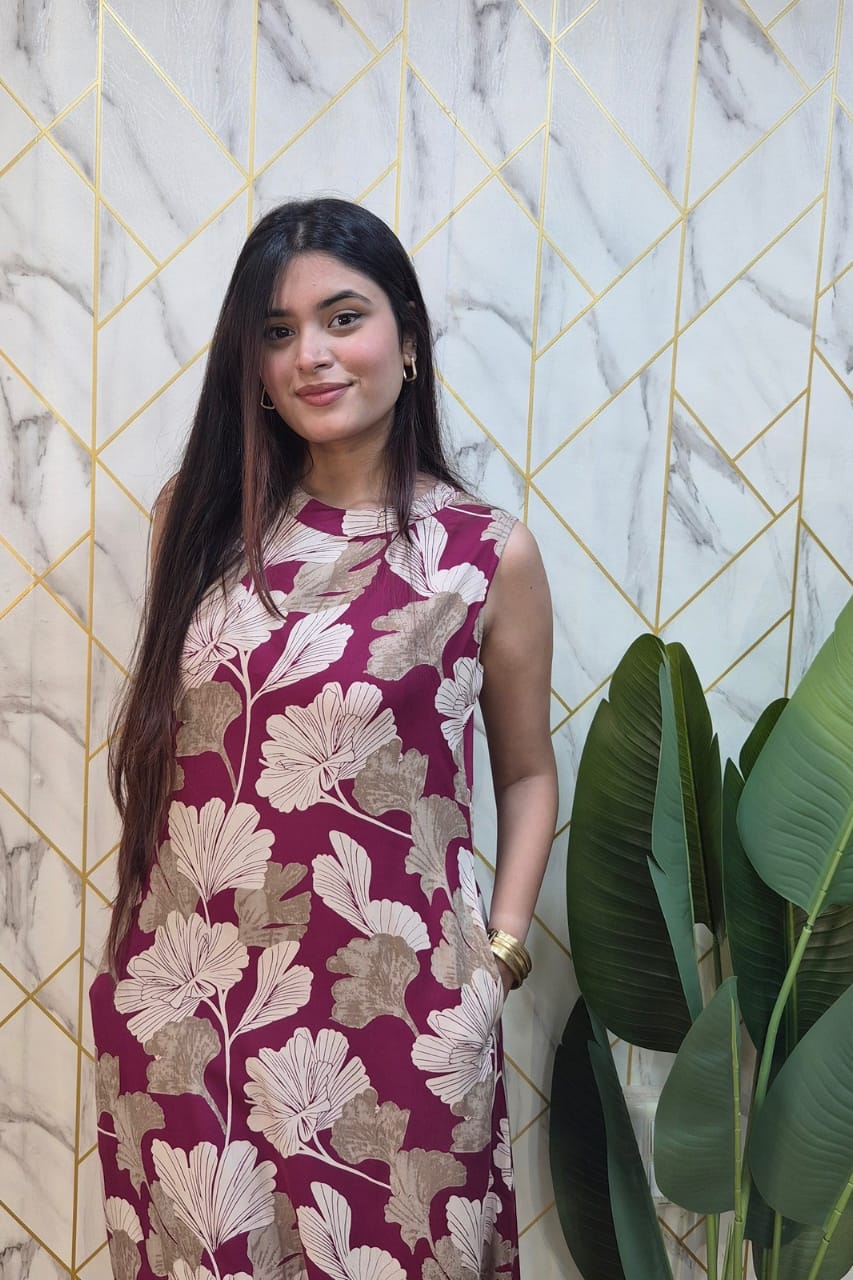 Maroon Floral Printed Sleeveless Cotton Salwar Kameez Kurti Pant A-line Suit for Women